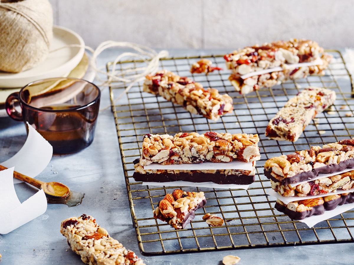 З горіхами кеш'ю, мигдалем, чорним шоколадом і вишнею, насінням соняшнику, концентратом яблучного соку, морською сіллю, листковим рисом, рисом і сиропом агави.