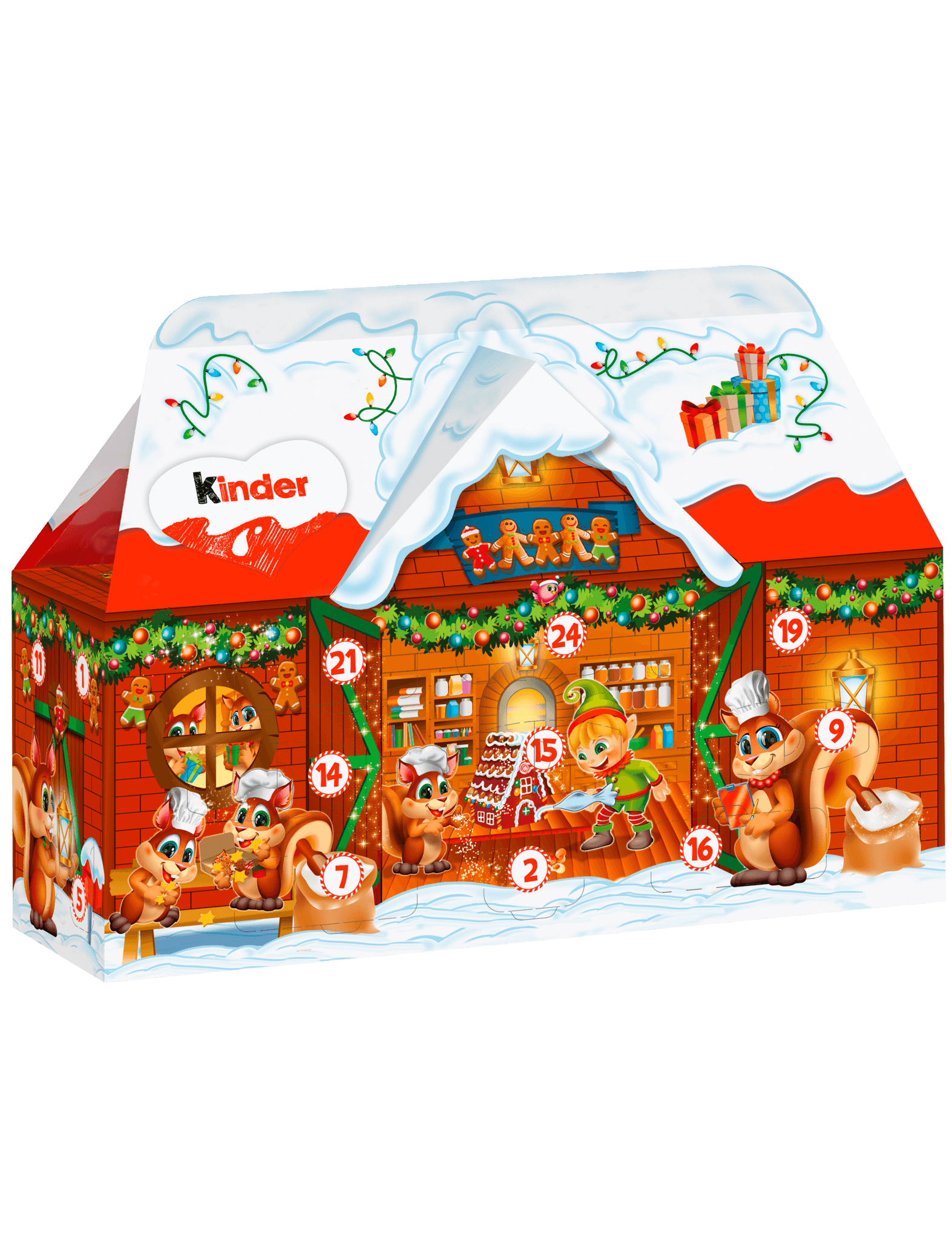 Будинок, повний веселощів. З Kinder Mix Advent Calendar 3D House різдвяний сезон стає солодким. Цей розкішно спроектований будинок виглядає як милий склад подарунків або солодка різдвяна пекарня, пропонуючи любовний погляд на повсякденне робоче життя Санта-Клауса. Чудовий календар, який розповідає історії за допомогою зображень. За 24 дверима, які прикрашають будиночок, ховаються смачні сюрпризи з популярного дитячого шоколаду.