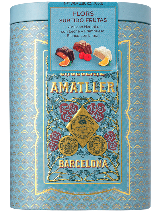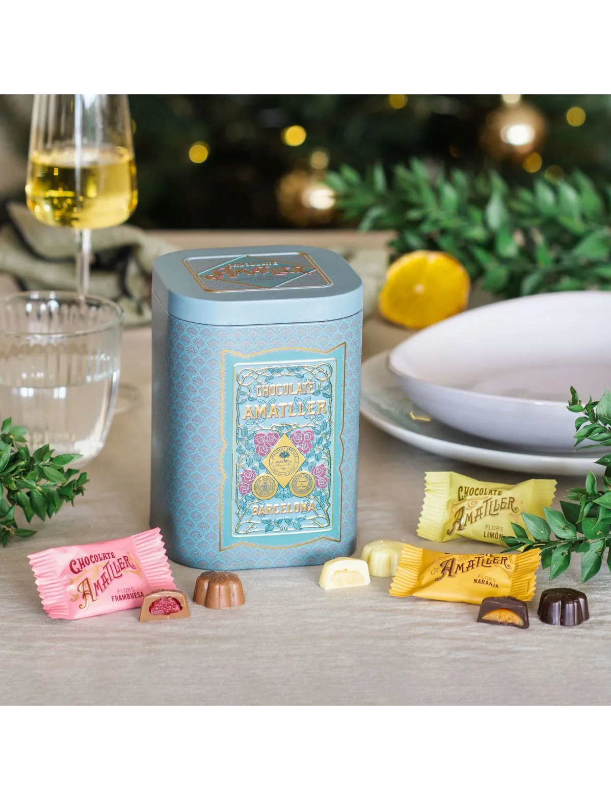 Приваблива металева банка, що містить три різновиди наших фруктових шоколадних цукерок: шоколадні цукерки з 70% какао та апельсиновим мармеладом всередині, шоколадні цукерки з малиновим мармеладом всередині та білі шоколадні цукерки з вершковим лимонним соком всередині. Ідеальний подарунок для любителів шоколаду, у поєднанні з фруктами, а також ідеально підходить для обіду чи вечері під час десерту.