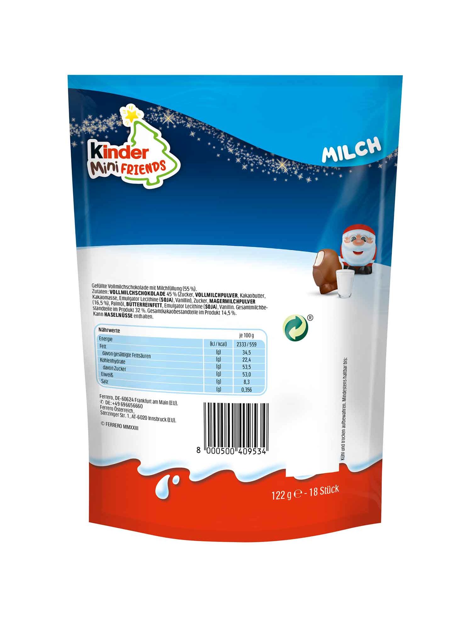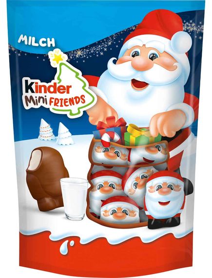 Солодкої різдвяної радості! Kinder Mini Friends Milk просто ідеально передає популярний смак шоколаду Kinder. Милі міні Санти виготовлені з ніжного молочного шоколаду, заправлені ніжним молочним кремом. Вони чудово підходять для прикраси подарунків, журнального столика або як сюрприз у чобітках Санти.