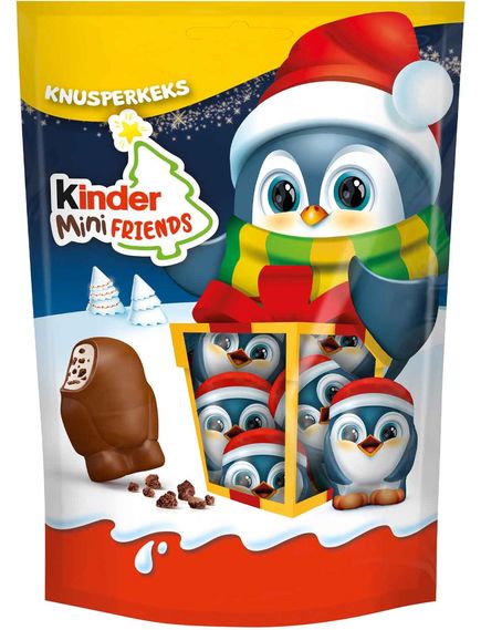Маленькі хрусткі друзі! Із солодким дитячими цукерками Mini Friends у різдвяні дні можна весело провести час. Милі пінгвіни зроблені з найкращого дитячого шоколаду, який усім відомий як чудове поєднання незбираного молочного шоколаду та ніжного молочного крему. Для додаткового хрускоту маленькі ласощі містять шматочки хрусткого печива.