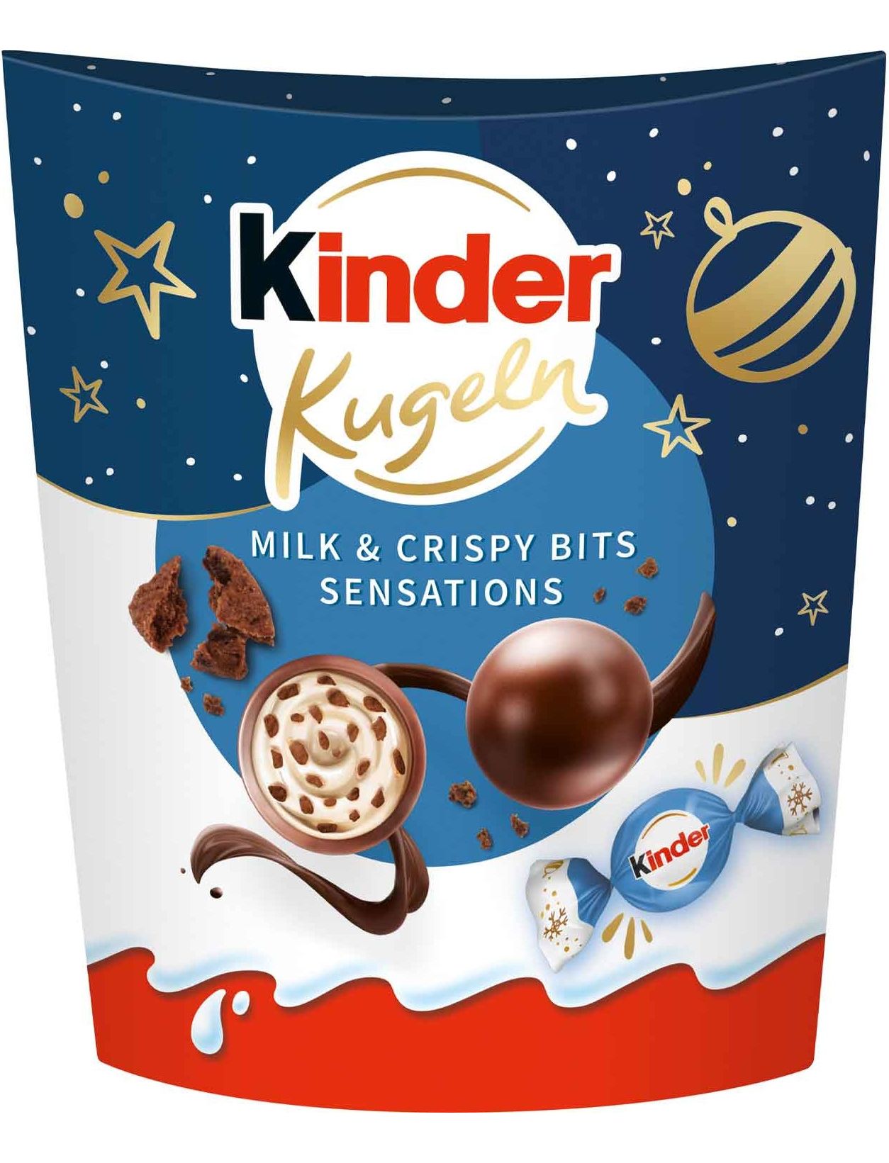 Кульки Kinder Milk & Crispy Bits Sensations поєднують у собі ніжний молочний шоколад з кремовою молочною начинкою та хрусткими какао-крихтами. Ці маленькі кульки пропонують гармонійне поєднання м’якої текстури та ніжного хрускоту – ідеально підходять для тих, хто хоче насолодитися кремовим шоколадом з легким натяком на хрускіт. Кожна кулька індивідуально загорнута та ідеально підходить для перекусу, спільного споживання або як солодке частування. Сучасний момент насолоди у типовому стилі Kinder – круглі, кремові та хрусткі одночасно.