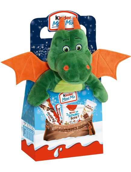 Якщо ви все ще шукаєте ідеальний подарунок на Різдво, ви потрапили за адресою. Плюшева іграшка Kinder Maxi Mix «Дракон» гарантовано викличе посмішку на обличчях дітей і дорослих. Ця м’яка іграшка заввишки приблизно 27 см з яскравими очима запрошує на грайливу гру та приховує солодкий сюрприз. Вибір із чотирьох різних ласощів від Kinder підсолоджує свята та ідеально доповнює цю ідею подарунка.