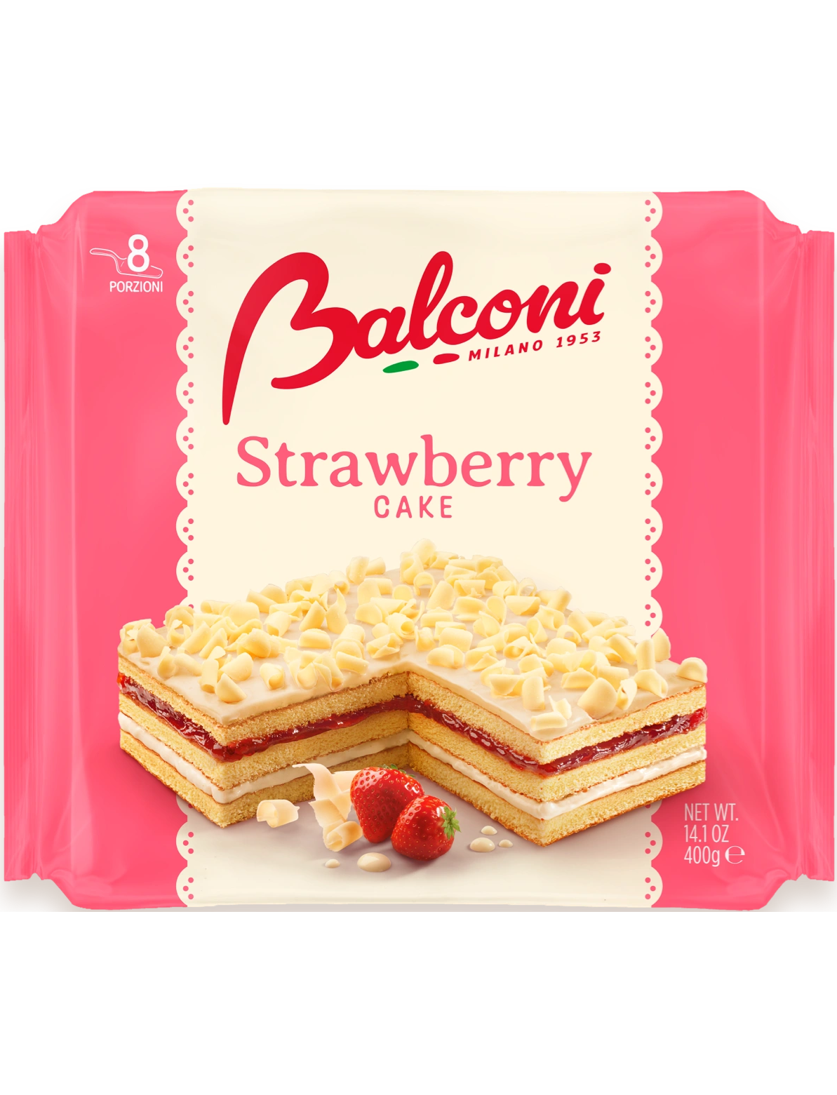 Склад: глюкозо-фруктозний сироп, цукор, лікер (глюкозо-фруктозний сироп, вода, спирт, ароматизатори), ПШЕНИЧНЕ борошно, ЯЙЦА, рослинні жири (пальмовий), полуничне пюре (5%), білий шоколад (5%) (цукор, сухе МОЛОКО) , масло какао, емульгатор: СОЄВИЙ лецитин, натуральний ароматизатор: ваніль), відновлене знежирене МОЛОКО (4,9%), рослинні олії (соняшникова, оливкова в різних пропорціях), сухе знежирене МОЛОКО (0,9%), лимонний сік, білки МОЛОКА, сухе МОЛОКО (0,4%), сіль, ПШЕНИЧНА клітковина, емульгатори : моно- та дигліцериди жирних кислот, СОЄВІ лецитини; гелеутворювач: пектини, регулятор кислотності: лимонна кислота, розпушувачі: карбонати амонію, карбонати натрію, дифосфати; консервант: сорбат калію, ароматизатори. Може містити сліди ГОРІХІВ.