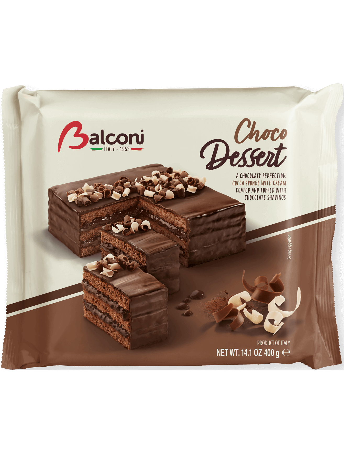Choco Dessert, спокусливий мікс какао: бісквіт і м'який крем, покритий і прикрашений смачними завитками білого, молочного і чорного шоколаду.