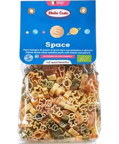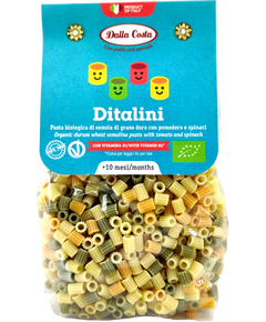 Склад: органічне борошно з твердих сортів пшениці Семола, зневоднені органічні помідори 0,8%, зневоднений органічний шпинат 0,4%, тіамін (Вітамін B1). Час приготування 8-10 хвилин. Зберігати в прохолодному сухому місці. Підходить для дітей з 10-го місяця життя.