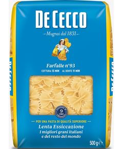 Склад: борошно Семола з твердих сортів пшениці, вода. Метелики № 93 Родом з Ломбардії та Емілії, Фарфалле отримав свою назву від типової форми метелика з маленькими вузькими галлами в центрі. До фарфалле рекомендованими приправами є ніжні соуси: соуси на основі вершкового масла, з...