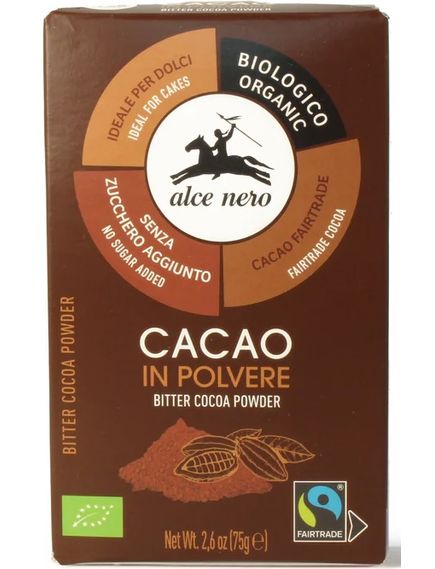 Цей какао-порошок виготовляється з какао-бобів з плантацій, де вони вирощуються відповідно до органічних правил. Виробники какао Fairtrade працюють відповідно до міжнародних стандартів справедливої торгівлі. Органічний какао-порошок Alce Nero ідеально підходить для додання повного смаку та аромату справжнього какао пудингам, десертам і напоям.