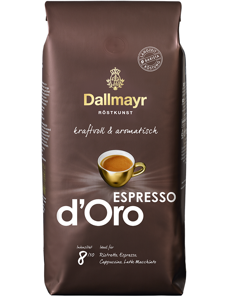 Для Dallmayr Espresso dOro високоякісні зерна арабіки та робусти обсмажуються дуже довго та дбайливо в традиційному ростері барабанного типу. В підсумку виходить еспресо з особливим характером, кожен ковток якого нагадує про Італію. м'який, насичений смак із делікатною ноткою какао. Підходить також для капучино та лате макіато.