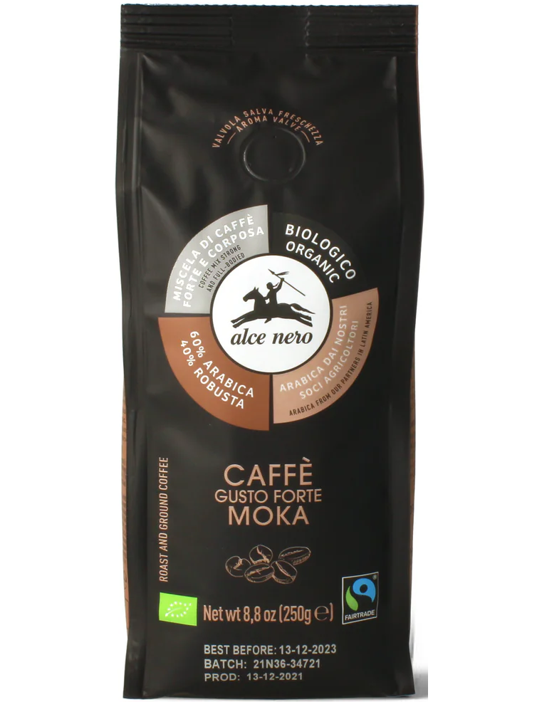 Органічна міцна кава Alce Nero для мокко-машин є результатом приємного балансу між добірною арабікою з безпомилковим ароматом, таким як тости, ваніль і фруктові ноти, і натуральною робустою, яка надає характеру, стійкості та структури з характерними відтінками какао та карамелі. примітки. Обволікаюча суміш.