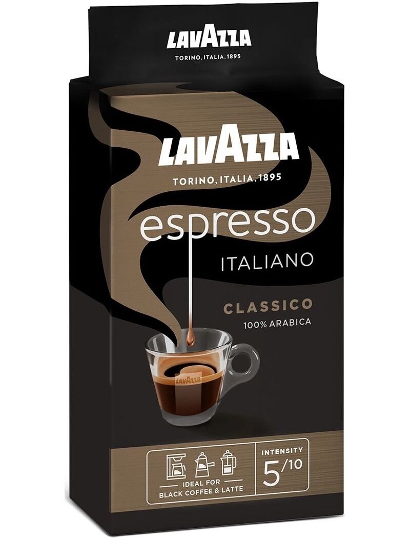 Натуральна мелена кава Lavazza Espresso середнього обсмаження середньо-тонкого помелу — найміцніша кавова суміш у лінійці Lavazza.