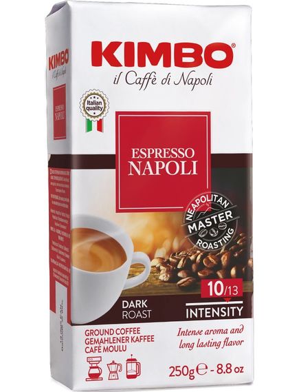 Кава Кімбо Еспресо Наполетано містить добірні зерна арабіки з найкращих плантацій Бразилії й окремих регіонів Америки, що додає смаку кавової солодкості з шоколадно-горіховими нотками. П'ята частина зерен — це міцна робуста, що дало кавовій суміші легку гірчинку й помірну міцність справжнього еспресо, яка заряджає енергією на увесь день. Зерна пройшли стадію темного обсмаження, внаслідок чого з'явилася міцна кава з інтенсивним смаком, насиченим ароматом. Про високу якість зерен свідчить також густа пінка, що виникає на поверхні приготованого еспресо.