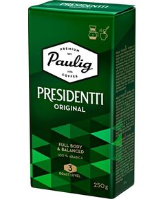 Paulig Presidentti Original складається з кавових зерен 100% арабіки з Центральної Америки. Має збалансований багатий смак з легкими нотами чорної смородини.