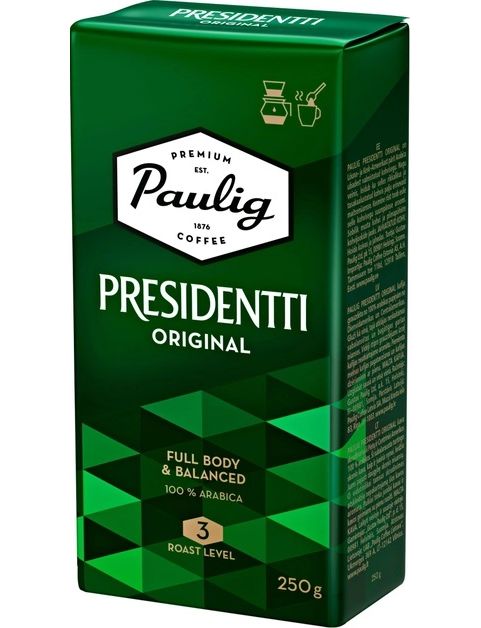 Paulig Presidentti Original складається з кавових зерен 100% арабіки з Центральної Америки. Має збалансований багатий смак з легкими нотами чорної смородини.