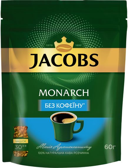 Розчинна кава Jacobs Monarch без кофеїну виготовлена із добірних кавових зерен, вміст кофеїну в якій не перевищує 0.3%, дарує незрівнянний Аромоксамит та насичений смак розчинної кави Jacobs Monarch.