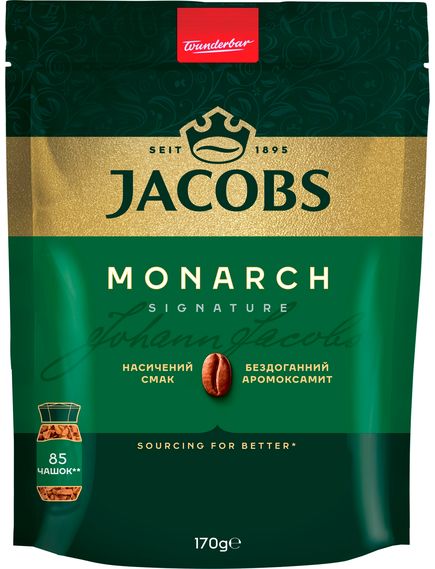 Jacobs Monarch - це високоякісна розчинна кава, що виготовлена за технологією сухого заморожування, яка дозволяє максимально зберегти смак та аромат кавових зерен у кожній гранулі. Незрівнянний Аромоксамит розчинної кави Jacobs Monarch з кожною чашкою дарує багатство аромату та насичений смак натуральної кави.