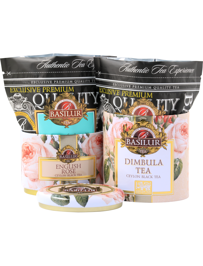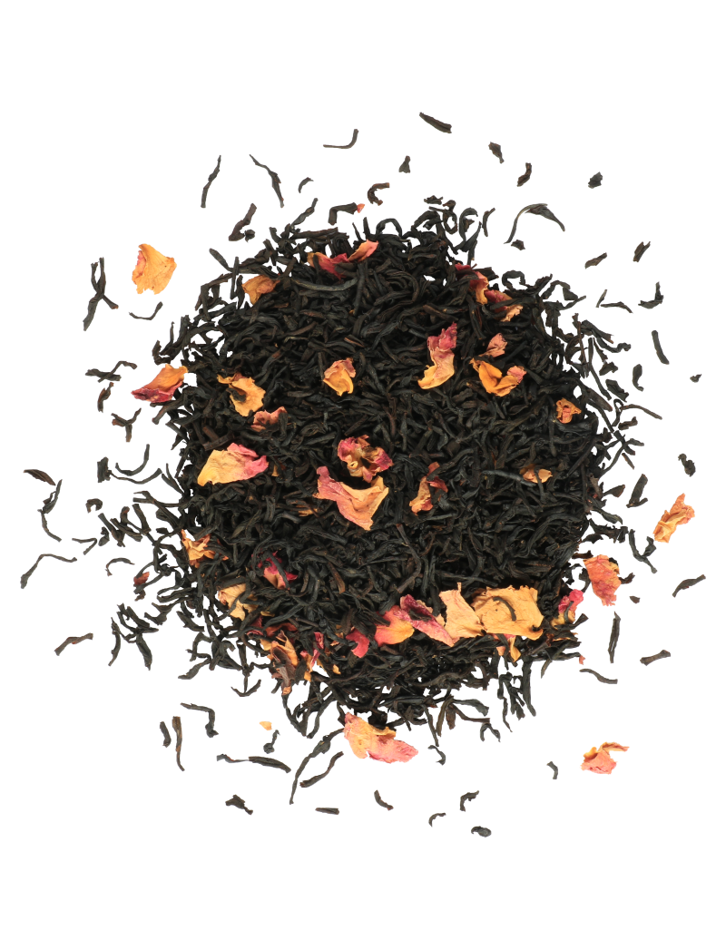 Англійська троянда: цейлонський чорний листовий чай (95,5%) з ароматом троянди (3,5%) і пелюстками троянд (1%).