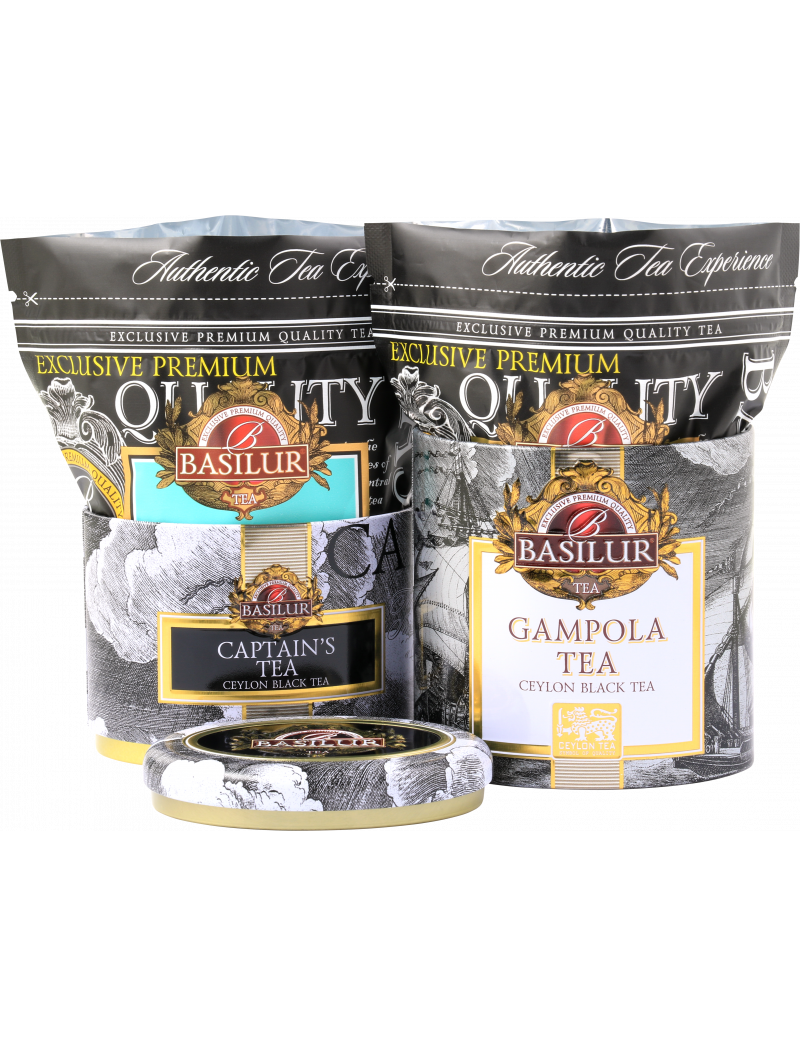 Склад: Верхня банка: чорний цейлонський листовий чай (95,75%), манго (1%) і ананас (1%), волошка (0,50%), чорнобривці (0,25%), сафлор (0,25%) і аромат бергамоту (0,75). %) і кориці (0,50 %). Нижня банка: 100% цейлонський чорний чай без добавок.