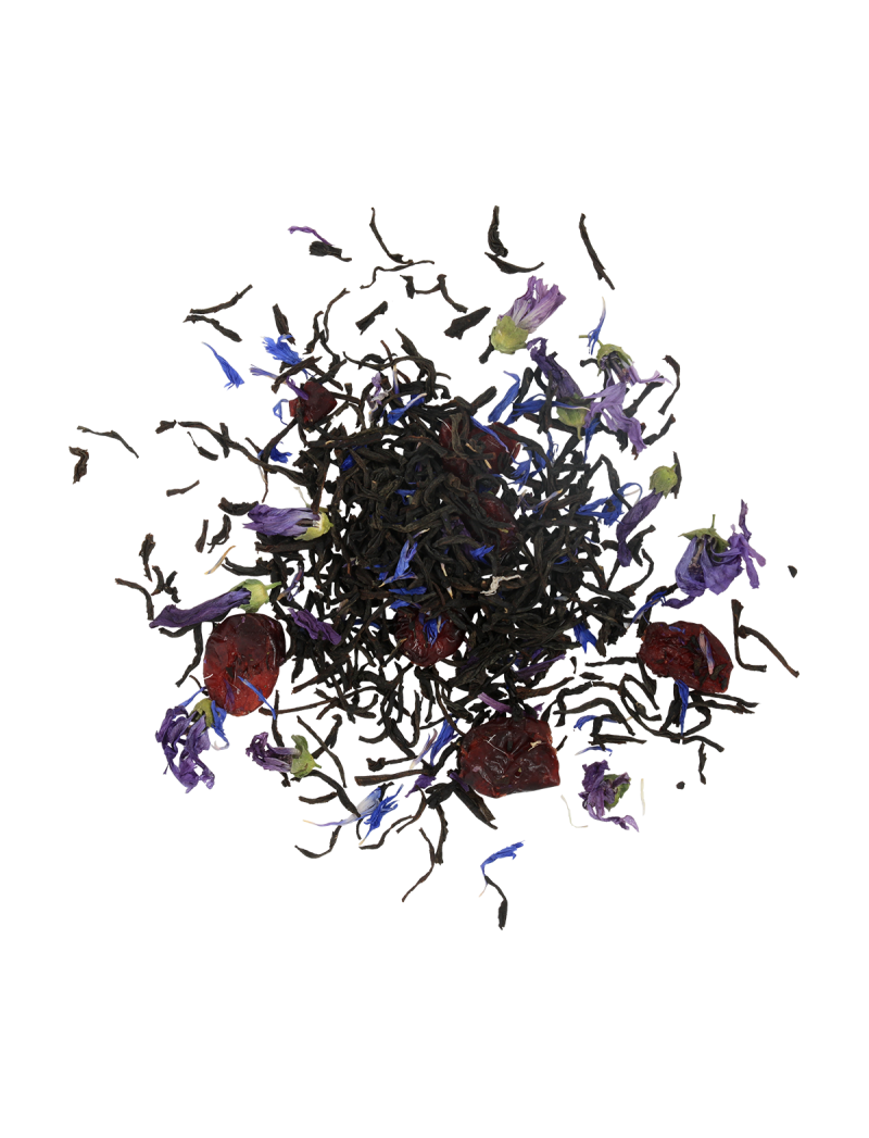 Цейлонський чорний чай з додаванням квітів волошки, блакитної мальви, плодів журавлини та нотками полуниці, абрикоса, ананаса та папайї.