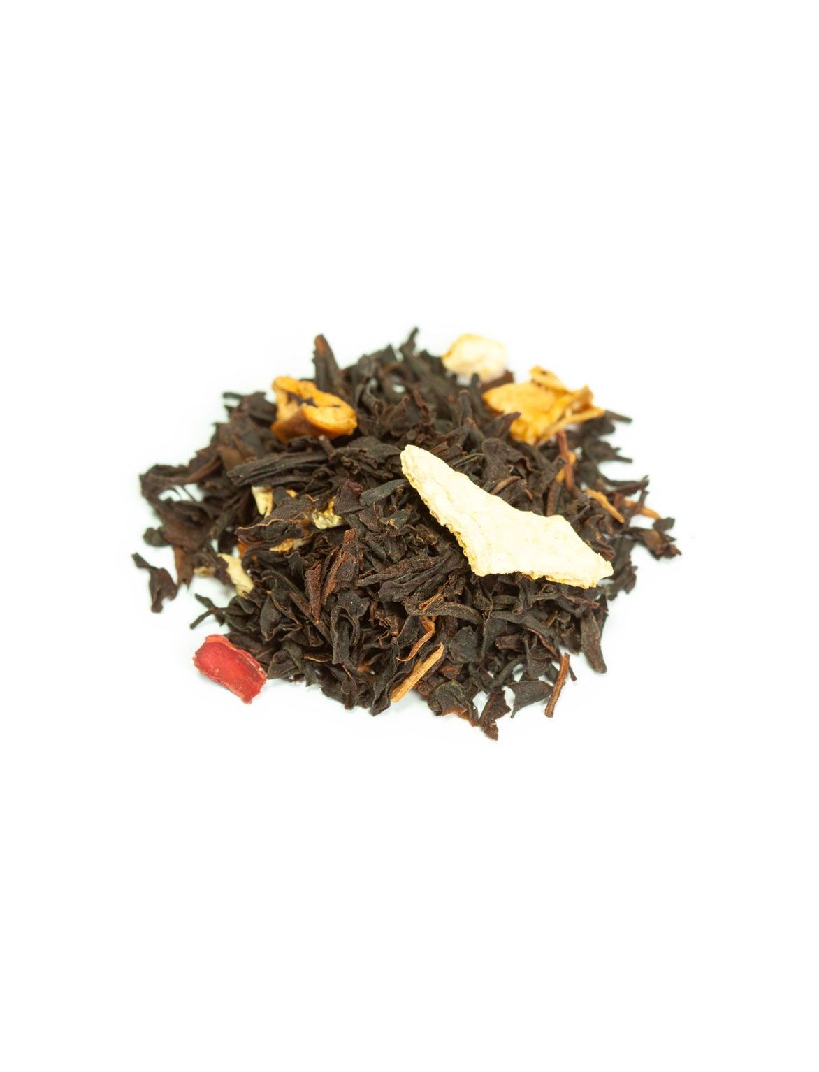Склад: чорний чай*, фрукти (цедра апельсина* 4%, яблуко*, плоди шипшини*), спеції 7% (кориця*, імбир*, гвоздика*, чорний перець*, кардамон*), гібіскус*, ефірні олії 1% (солодкий апельсин*, червоний апельсин*), луснутий мигдаль* , натуральний яблучний аромат*, екстракт кориці*. *З органічного землеробства.