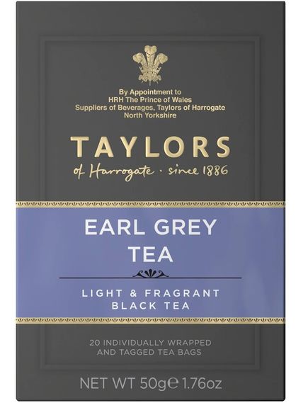 Чай чорний з ароматом бергамоту пакетований Earl Grey (Ерл Грей) ТМ TAYLORS of Harrogate (Тайлорс оф Харрогайт). Місце вирощування чайного листа: Китай. Склад: чай чорний, натуральний ароматизатор бергамоту з іншими натуральними ароматизаторами 5%. Рекомендації щодо приготування: покласти пакетик у підігріту чашку, залити окропом. Настоювати протягом (4-5) хв. Додайте за бажанням молоко чи лимон або насолоджуйтесь чистим смаком. Умови зберігання: зберігати у сухому прохолодному місці. Берегти від потрапляння прямих сонячних променів.