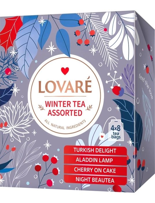 Новорічна колекція чаю Winter Tea Assorted від Lovare 4 види по 8 шт, пакетований чай в індивідуальних конвертах - Cherry on cake, Night beautea, Aladdin lamp, Turkish delight.
