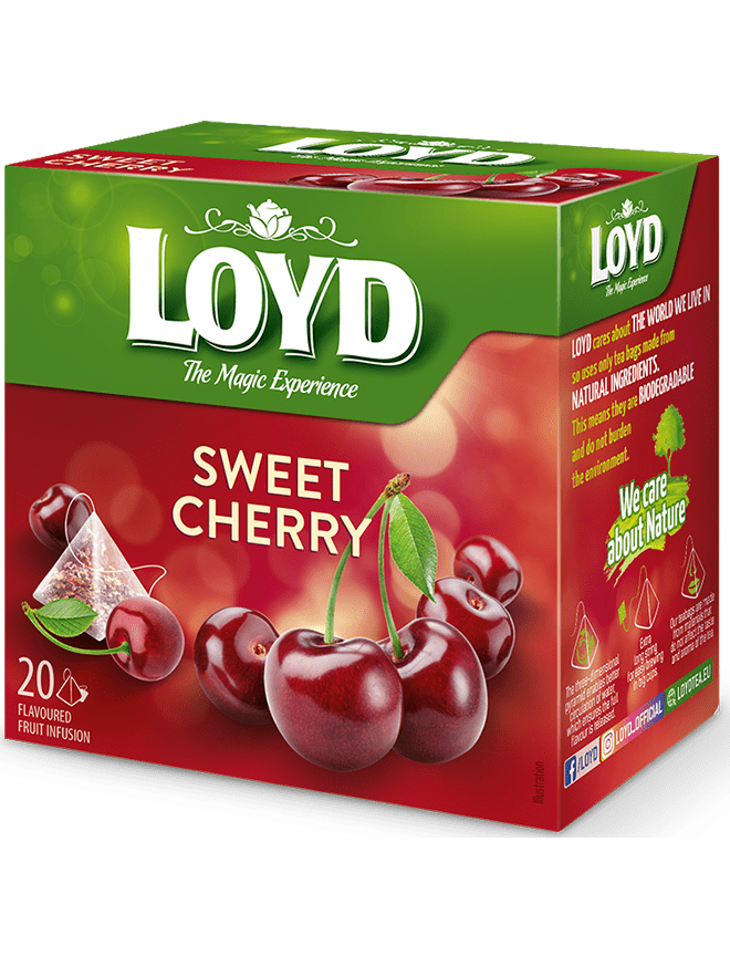 Щоб насолодитися неповторним смаком вишні, не обов’язково чекати липня. Фруктовий чай Loyd подарує вам відчуття літа в будь-яку пору року! Черешня – майбутній хіт. У завареному вигляді він радує глибоким і насиченим кольором, виразним ароматом і чарівним смаком.