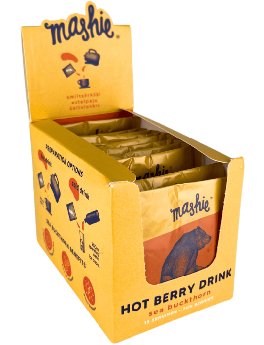 Як і всі натуральні напої з ягідного пюре, Mashie - це новий вибір для любителів гарячих напоїв, натхненний традиціями північних земель. Поживні та безперечно смачні ягоди були змішані разом, щоб ваше тіло та розум відчували себе задоволеними та здоровими. Спробуйте його як гарячий або холодний освіжаючий напій протягом дня, вранці чи ввечері.