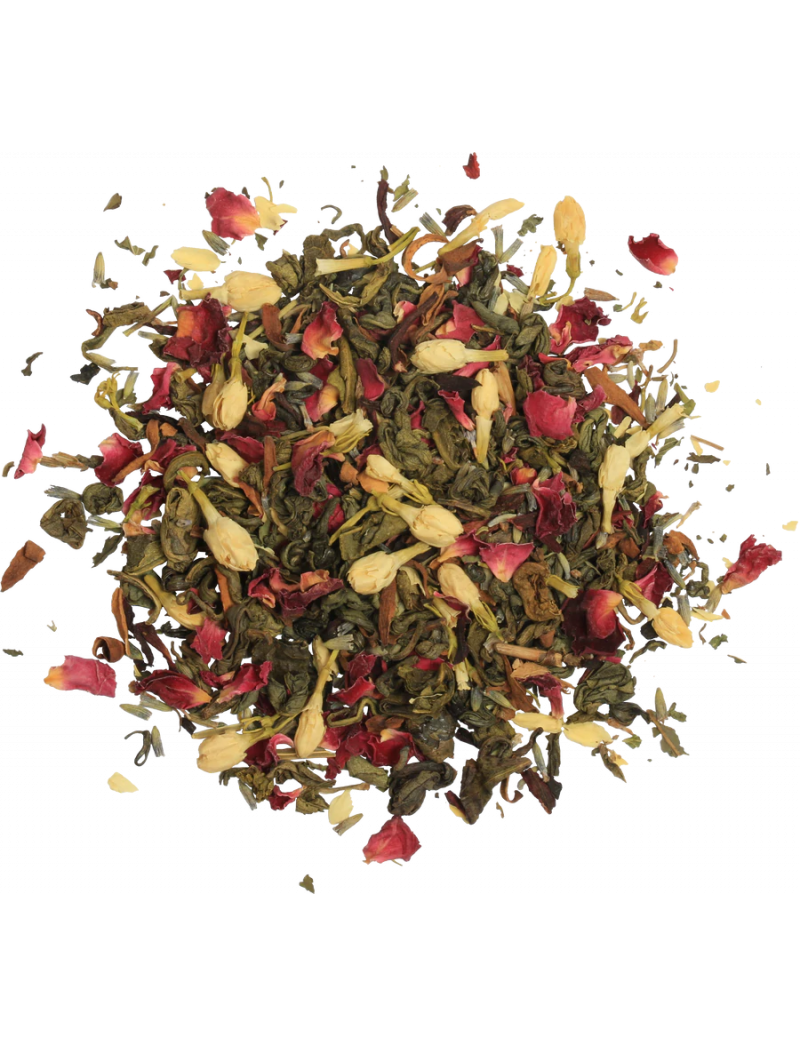 Композиція ретельно відібраного листя цейлонського зеленого чаю з додаванням перцевої м'яти, квітів лаванди, гібіскуса, жасмину, апельсина та троянди.