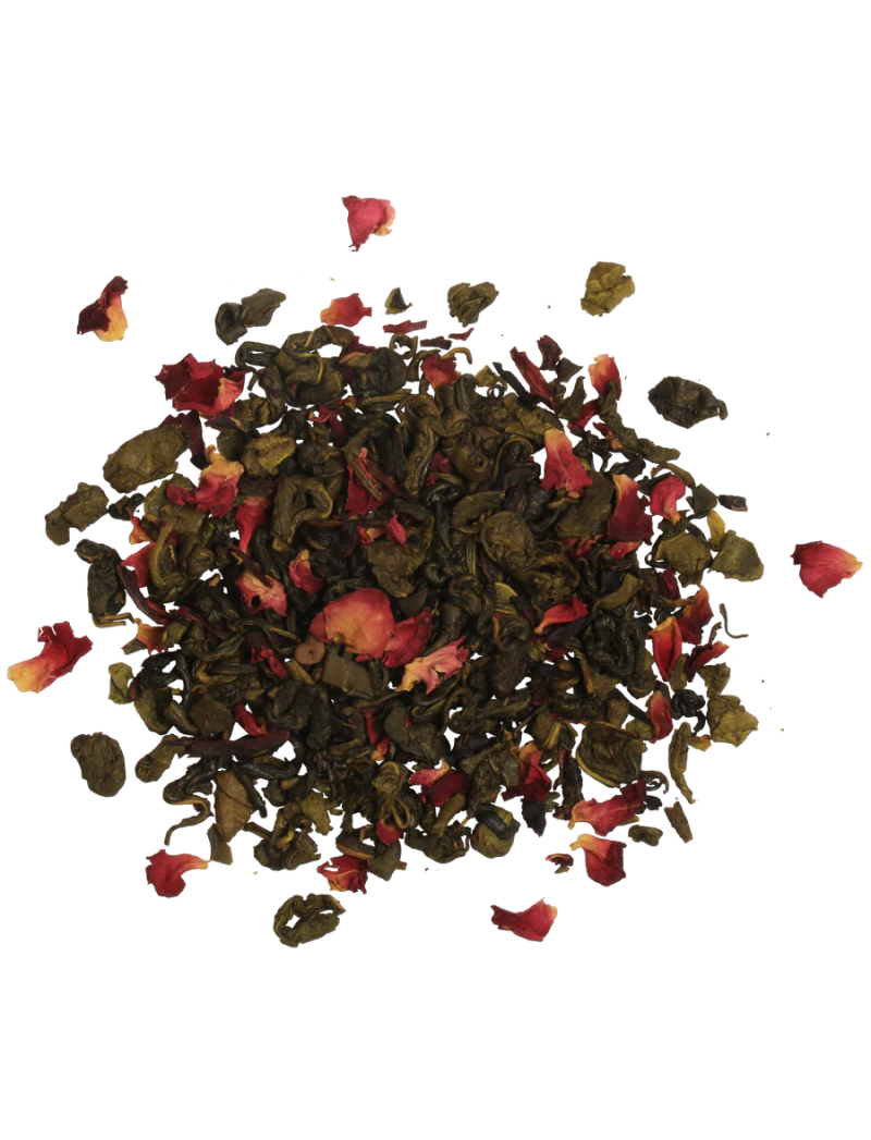 Композиція ретельно відібраного зеленого чаю Young Hyson Ceylon з додаванням квітів гібіскуса, троянди та натурального аромату троянди.