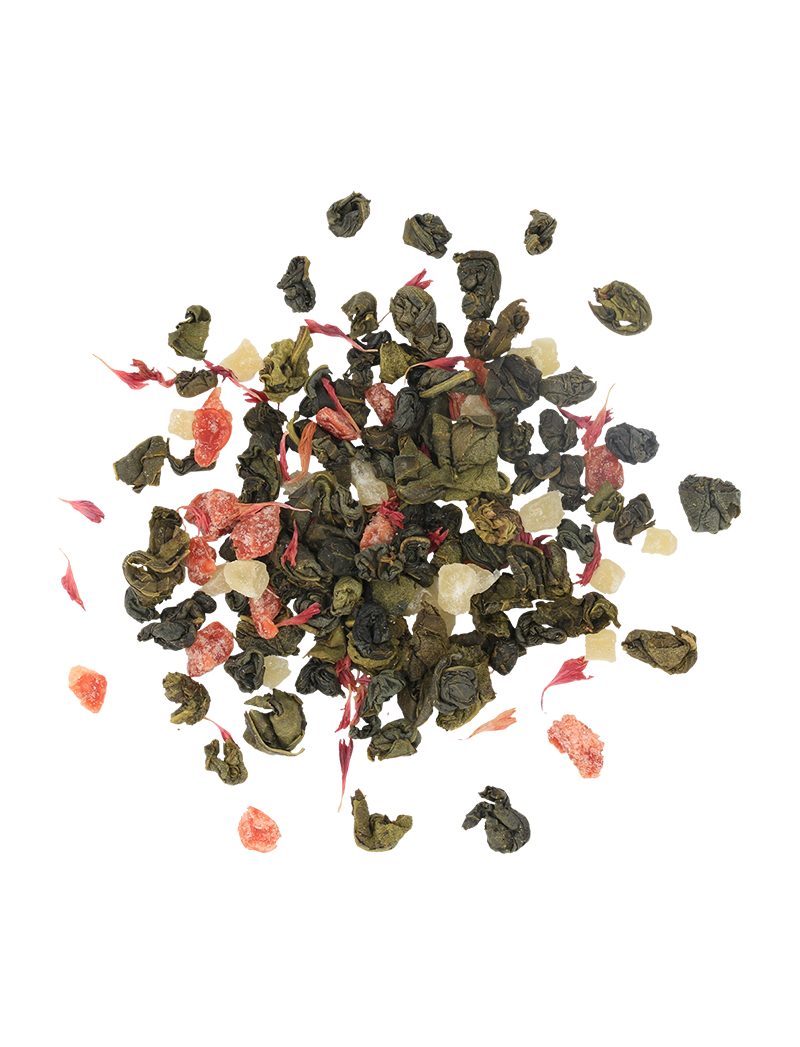 Композиція цейлонського зеленого чаю з додаванням аромату ананаса, вишні, волошки та вишні.