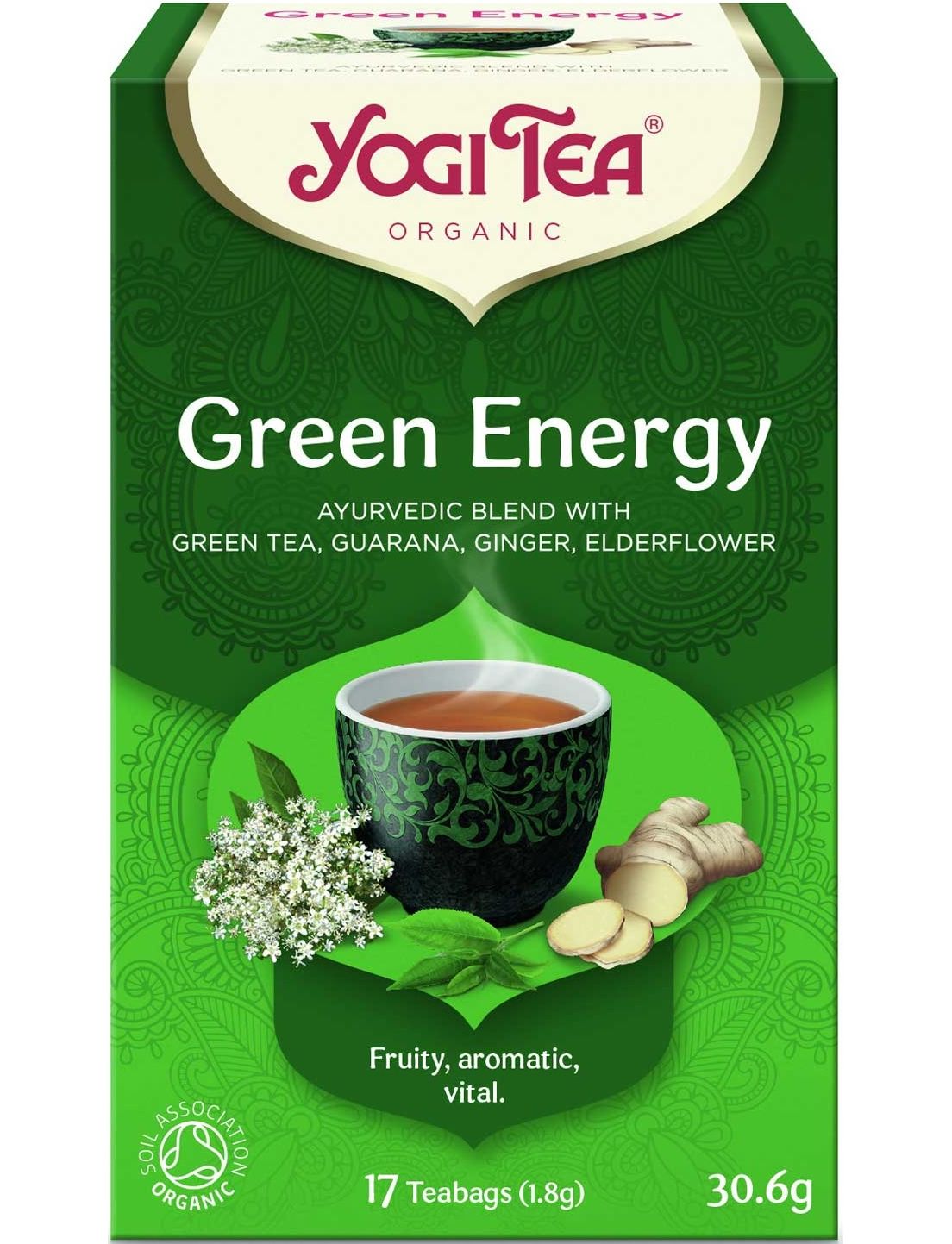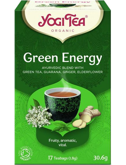 Ваш акумулятор розряджається? Тоді дозвольте цьому чаю з інтенсивним смаком підняти вам настрій. Зелений чай набуває особливого смаку завдяки додаванню фруктової лимонної вербени та квітів бузини з невеликою кількістю імбиру, гуарани та екстракту чайного гриба. Завдяки цьому YOGI TEA® Green Energy освіжає вас абсолютно природним чином!
