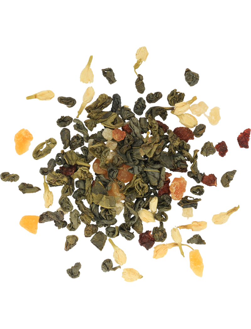 Цейлонський зелений чай, високогірний, листовий з додаванням бутонів жасмину, ананаса, плодів шипшини, манго та відтінком полуниці.