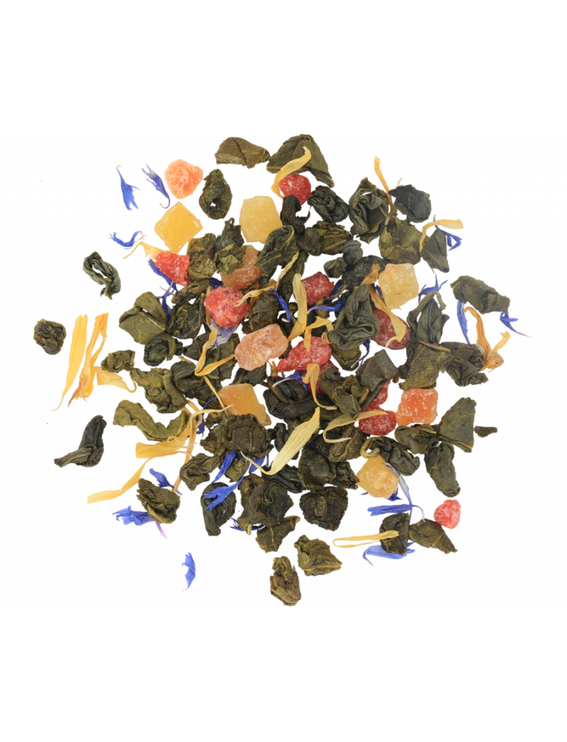 Зелений чай Цейлону та інших регіонів з додаванням папайї, лісової суниці, волошки, чорнобривців та аромату суниці.