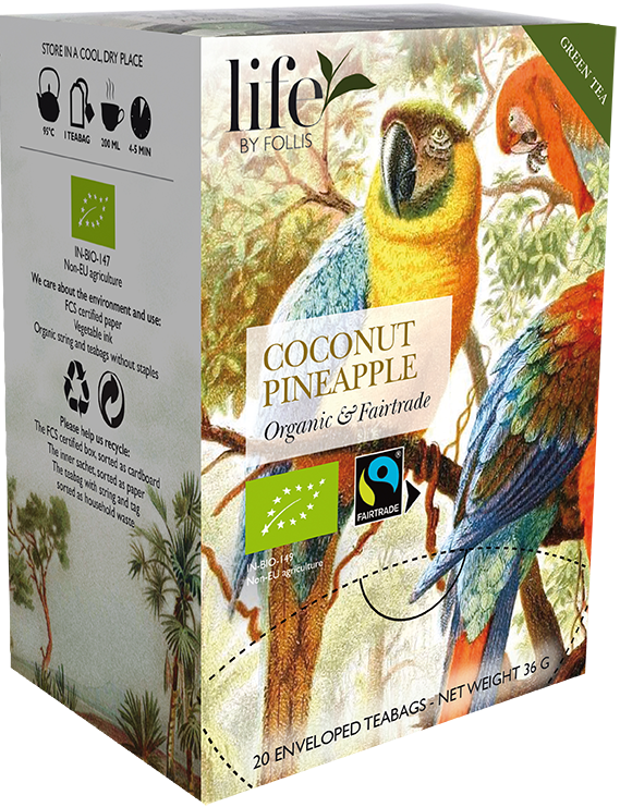 Уявіть здорову Піна Коладу. Ось чарівна чашка зеленого чаю зі смаком свіжого ананаса та круглого кокосу, яка ідеально підійде для будь-якого дня. Яка мрія! Органічний і сертифікований Fairtrade.