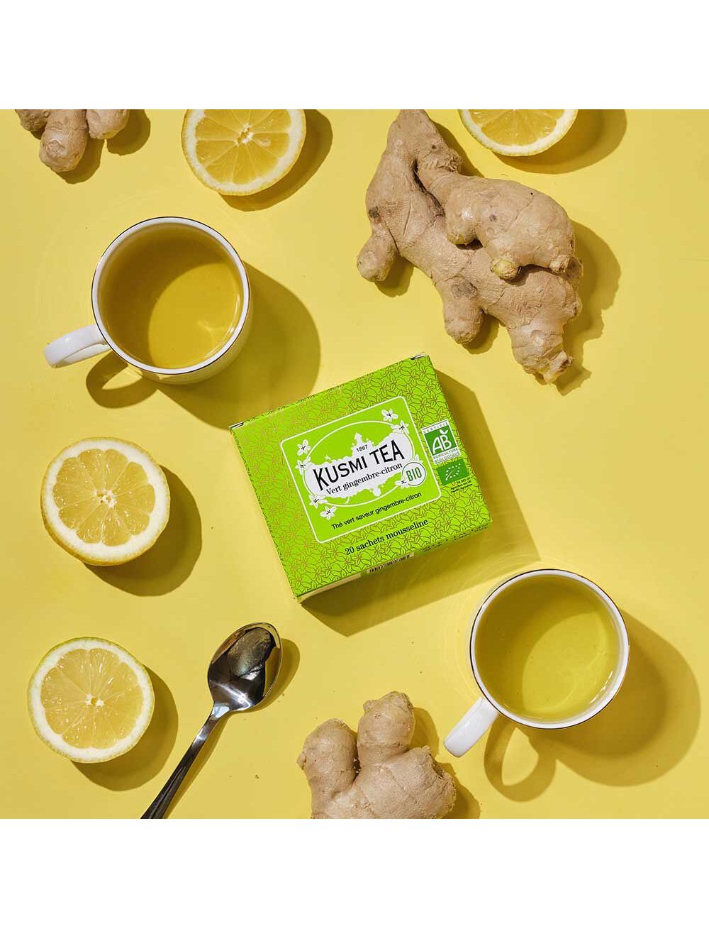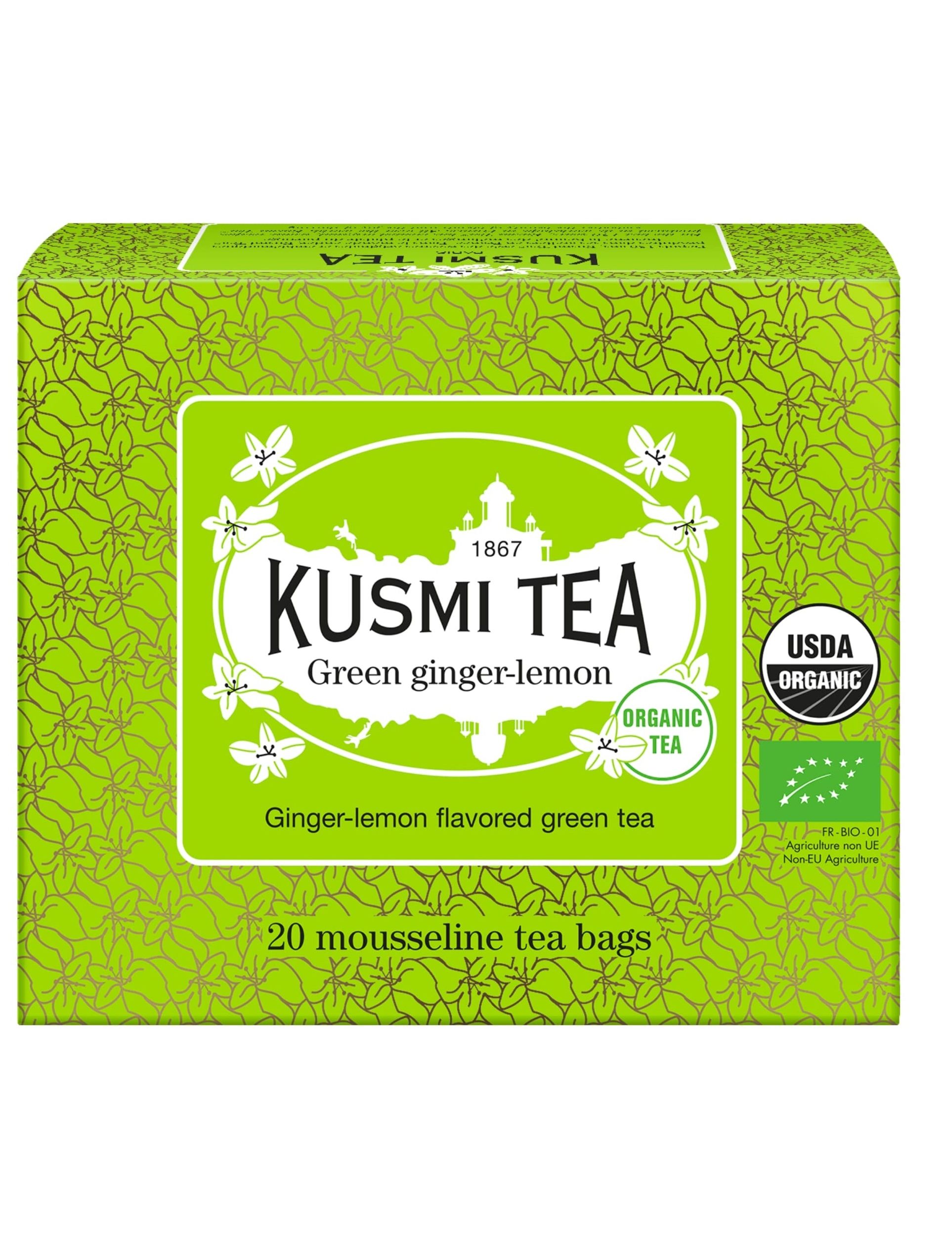 Органічний зелений чай зі смаком лимону та пряного імбиру. У 20 муслінових саше.