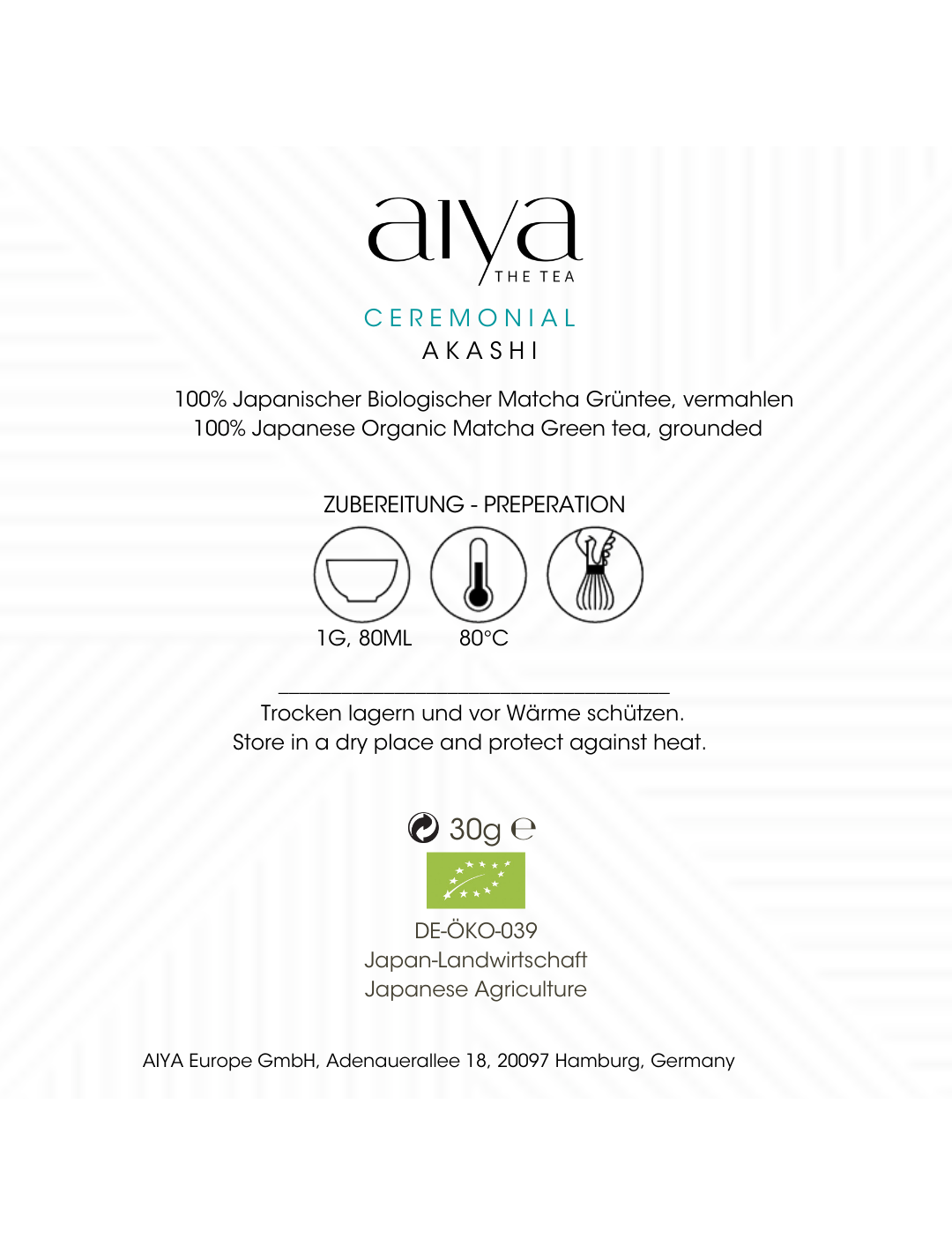 Ceremonial Matcha Akashi - найпопулярніший сорт матча. Органічний Akashi matcha від aiya-THE TEA має насичений аромат із фруктовим смаком і поєднує в собі всі чудові властивості матчі в одному: м’який, делікатно гіркий, м’який, солодкий і поживний. Ім'я «Акаші» означає «світло»; нагадує світло-зелений колір чаю матча. Ceremonial Matcha Akashi — ідеальний повсякденний напій для поціновувачів матча та «Матча преміум-класу для початківців».