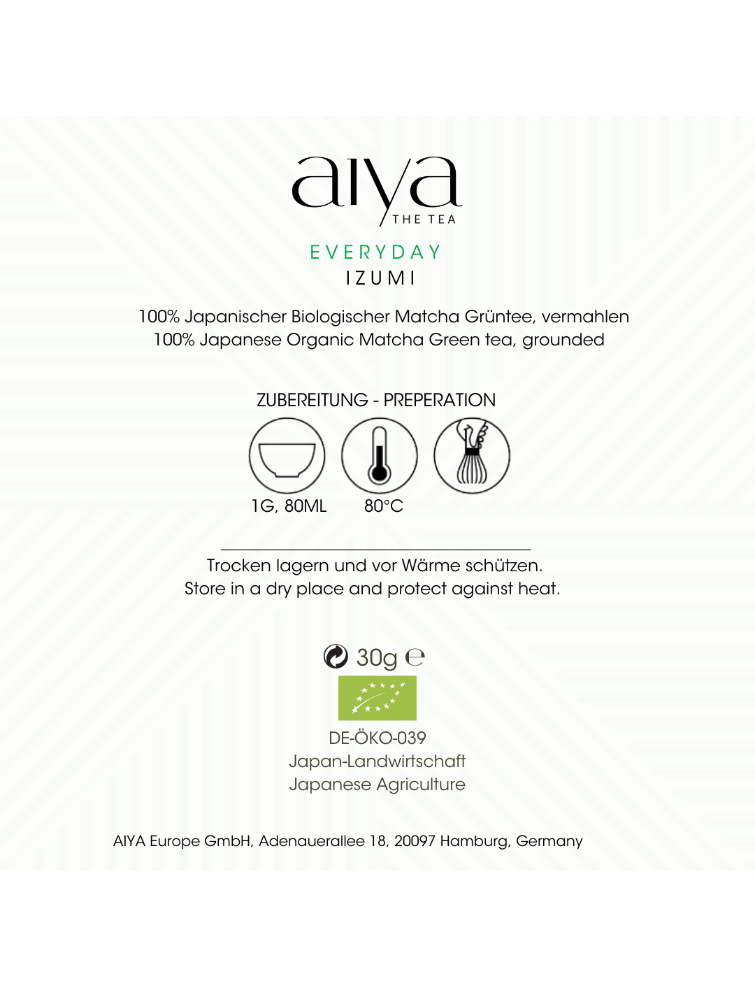 Everyday Matcha Izumi — ідеальний чай для тих, хто хоче спробувати Matcha вперше. Як і всі продукти від aiya – THE TEA, він виробляється органічно. Це ідеальний чай для знайомства зі світом матчу, перш ніж переходити до більш якісних сортів. Matcha для початківців також ідеально підходить для використання в кулінарії, як веганський напій Matcha з молоком або соєвим молоком, наприклад Matcha Latte. Також він напрочуд хороший як інгредієнт десертів. Дозвольте собі надихнутися нашими різними рецептами .