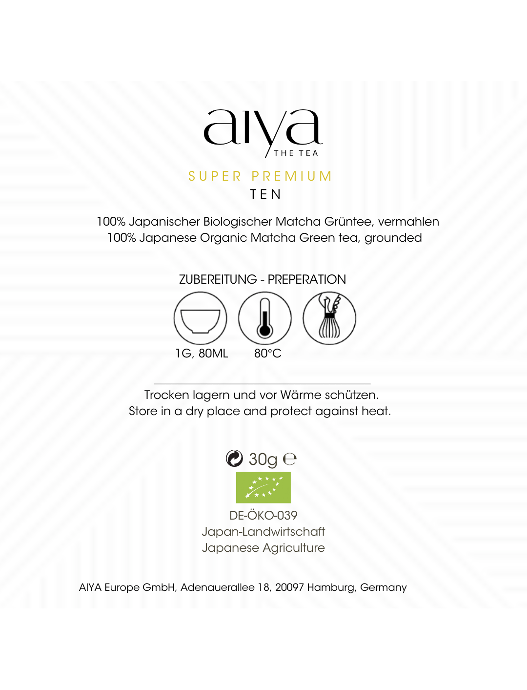 Super Premium Matcha Ten — це обмежене видання японського першокласного органічного чаю матча. Він має солодкий, але м’який, легкий, фруктовий, свіжий та інтенсивний смак. Його неймовірно красивий і сяючий нефритовий зелений колір дає вам передчуття його тонкого аромату. Ten пропонує чудову якість органічного чаю матча.
