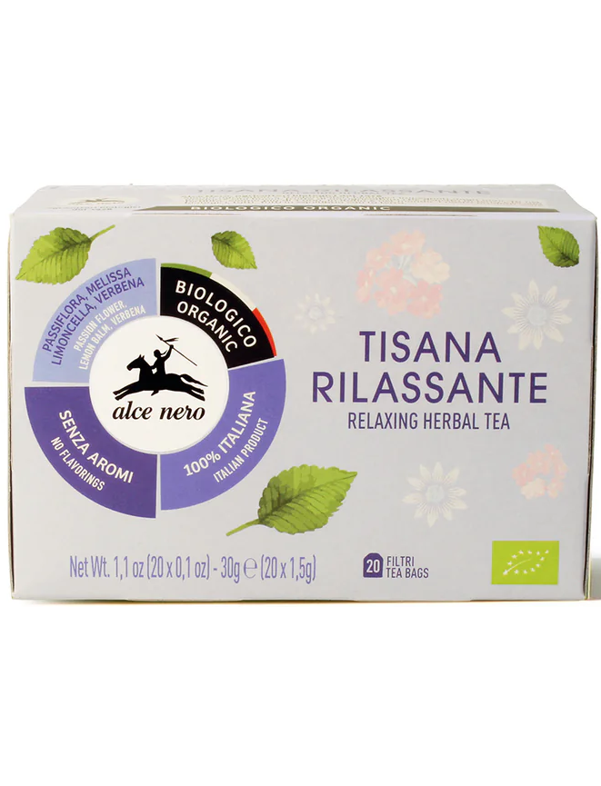 Розслаблюючий трав'яний чай Alce Nero характеризується свіжим смаком меліси, яка пахне лимоном, а також присутністю пасифлори та вербени, які завдяки своїм розслаблюючим властивостям роблять його ідеальним для вживання особливо ввечері, після харчування.