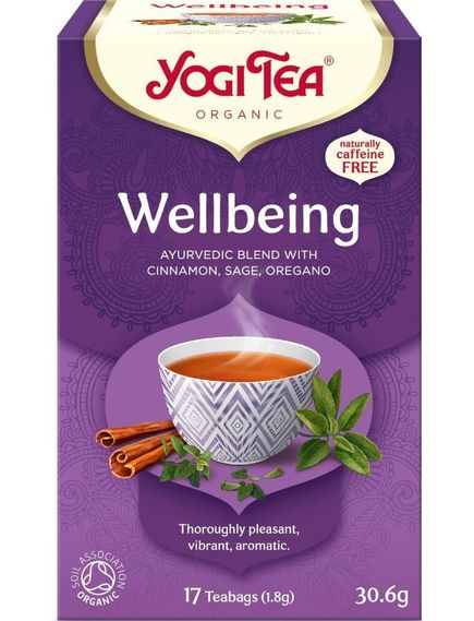 Добробут починається з бажання його відчути. Цей чай направляє та супроводжує вас у сонячний тайм-аут. Зігріваючою корицею та ароматною шавлією YOGI TEA® Wellbeing нагадує середземноморський відпочинок. Ви можете відчути смак самого життя в лемонграсі та орегано та черпати свіже натхнення з глибокого відчуття благополуччя!