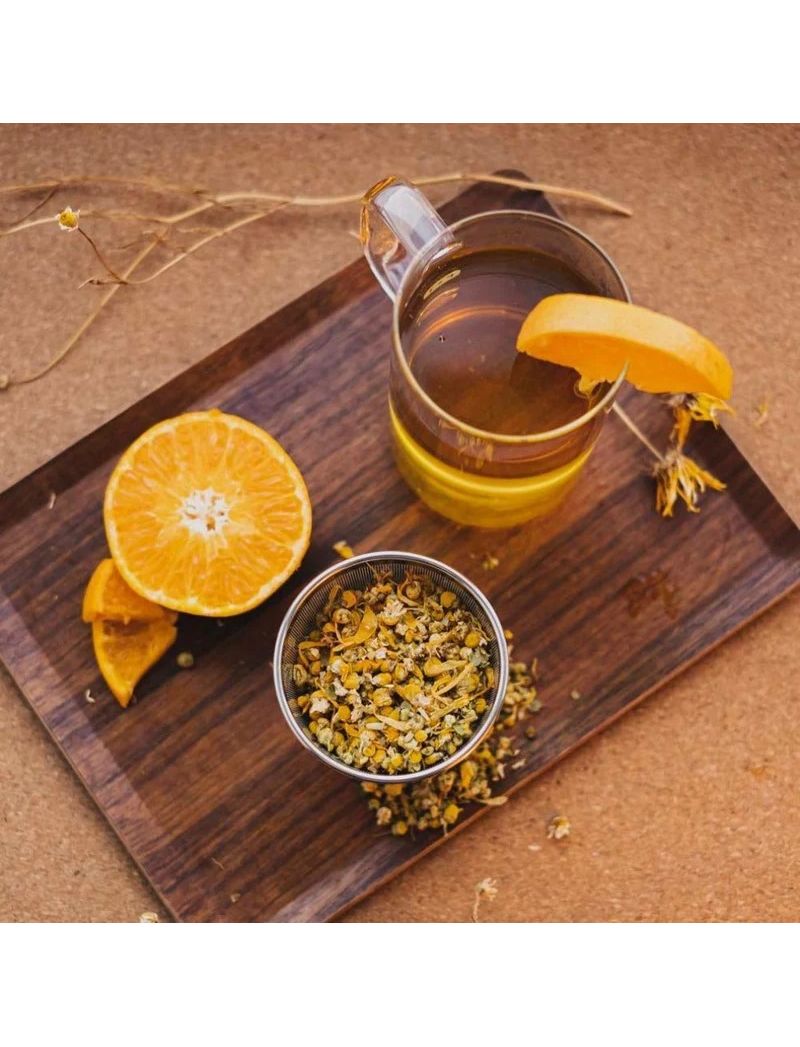 Століттями ромашку цінували за її заспокійливі та антибактеріальні властивості. Ми також вважаємо, що це дуже смачно, і поєднали його тут із яскравим апельсином для веселого та потужного освіжаючого напою на цілий день