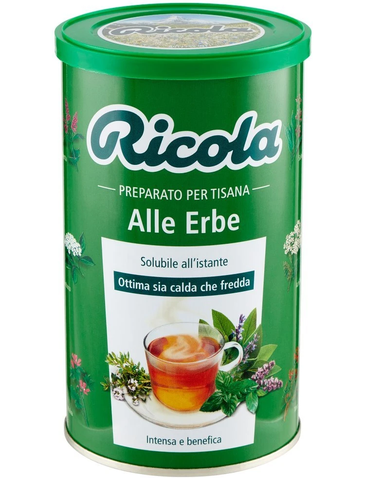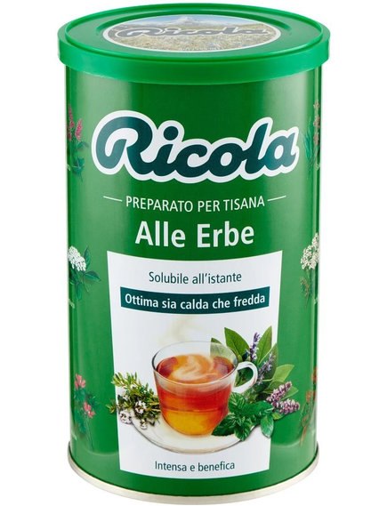 Склад: цукор, декстроза, екстракти (2,7%) трав'яної суміші Ricola (подорожник, алтей, м'ята, чебрець, шавлія, манжетник, деревій, кровохлібка, мальва, бузина, первоцвіт, вероніка, м'ята); карамелізований цукор, натуральні м'ятні ароматизатори.