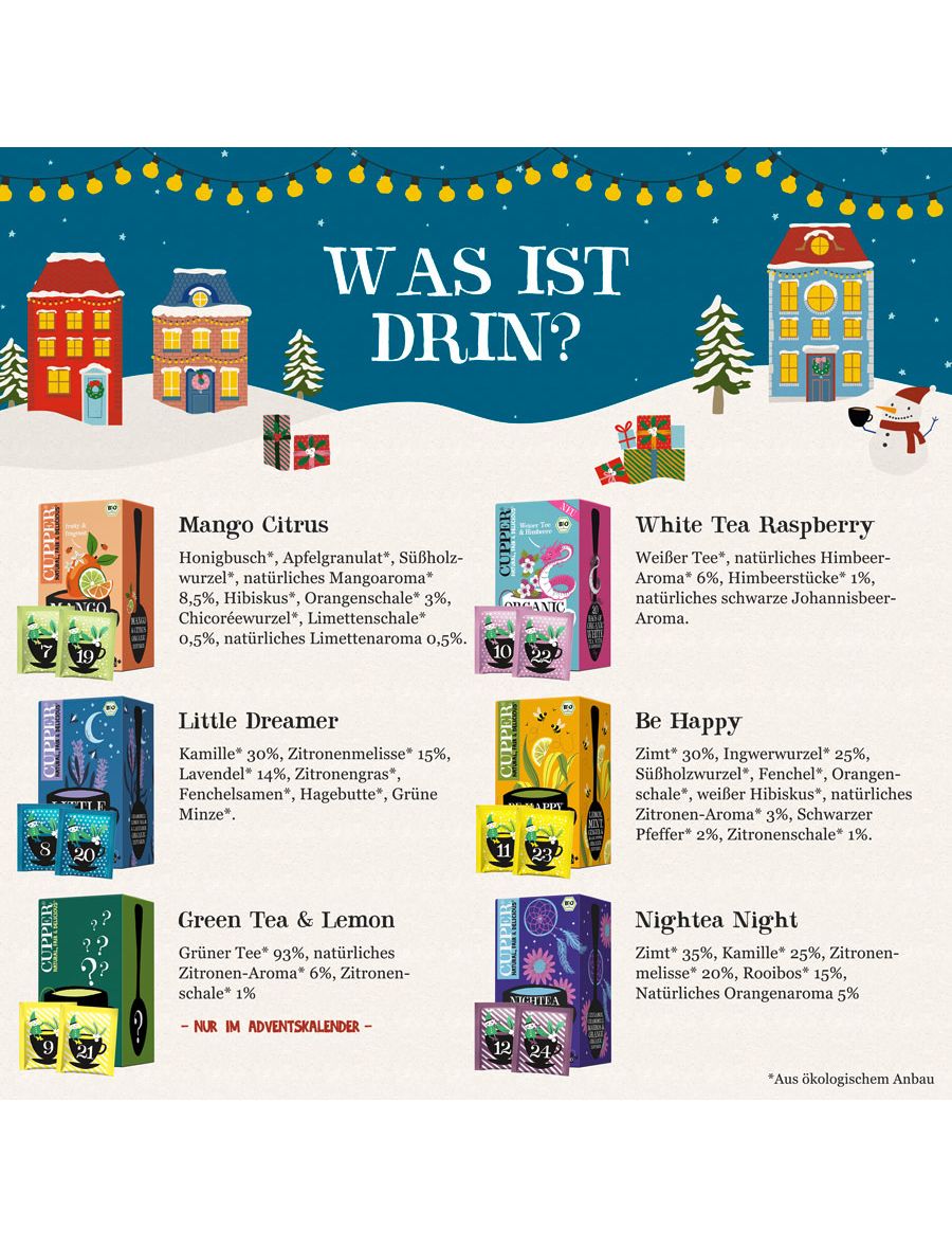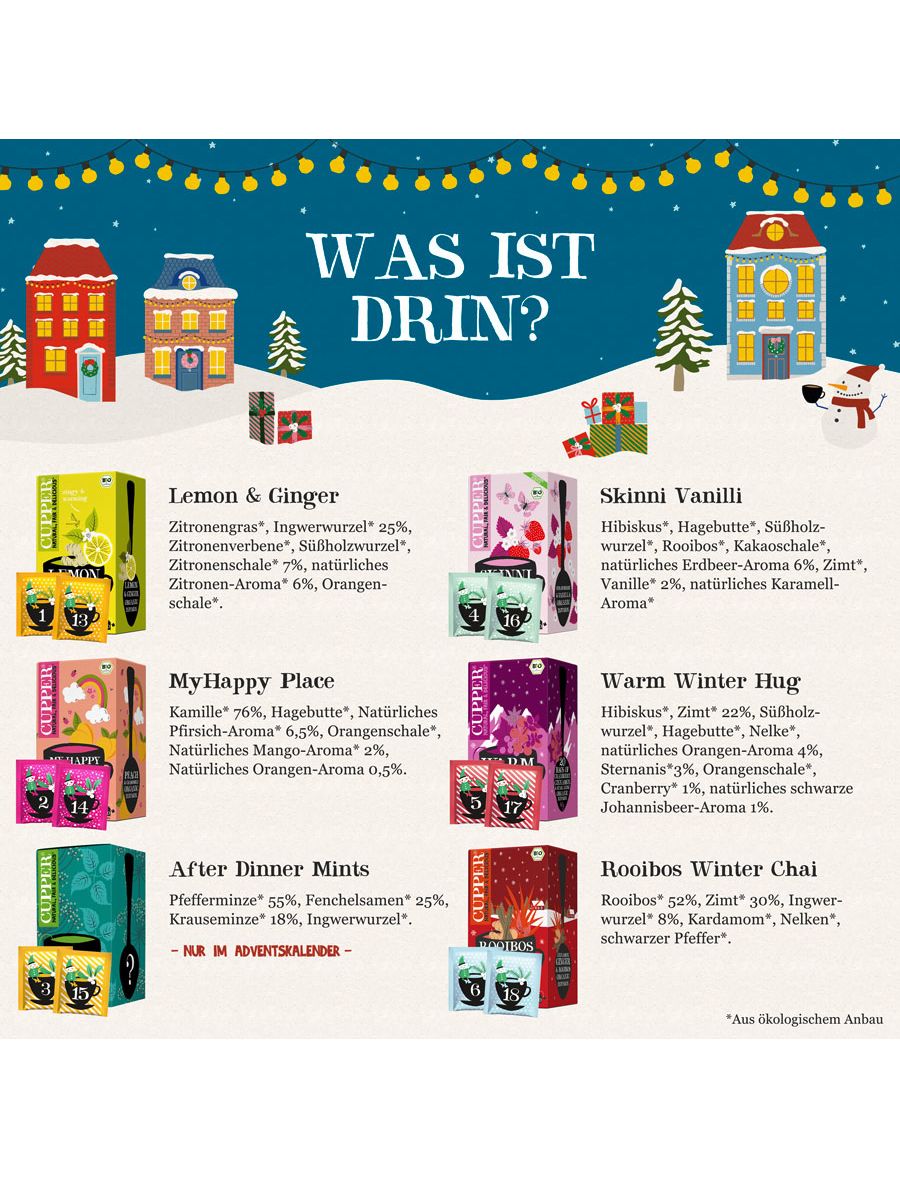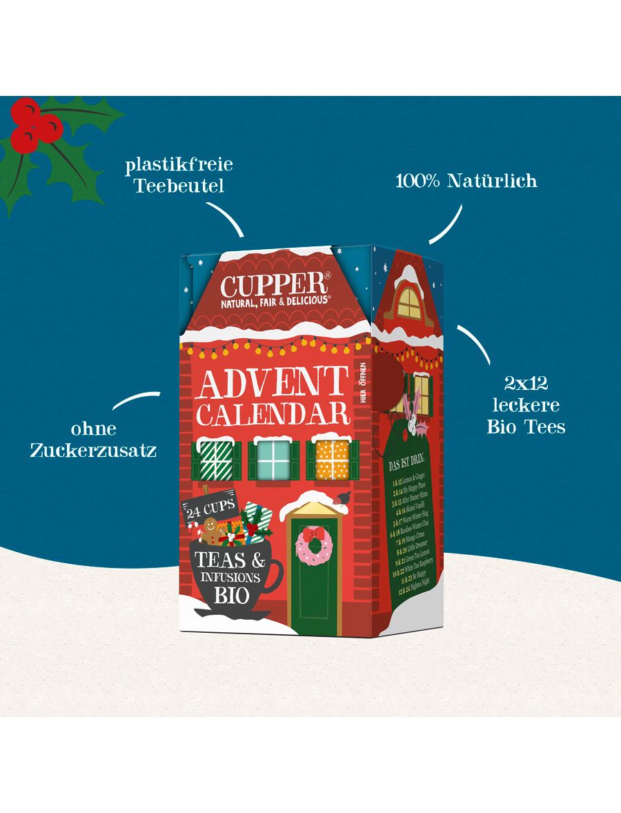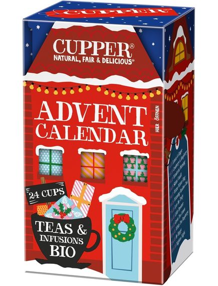 Адвент-календар Cupper Tea пропонує смачну насолоду від органічного чаю. З 24 чашками чаю він щодня наближає Різдво та підсолоджує передріздвяний сезон популярними класичними напоями та новими спокусами. Він також ідеально підходить як подарунок.
