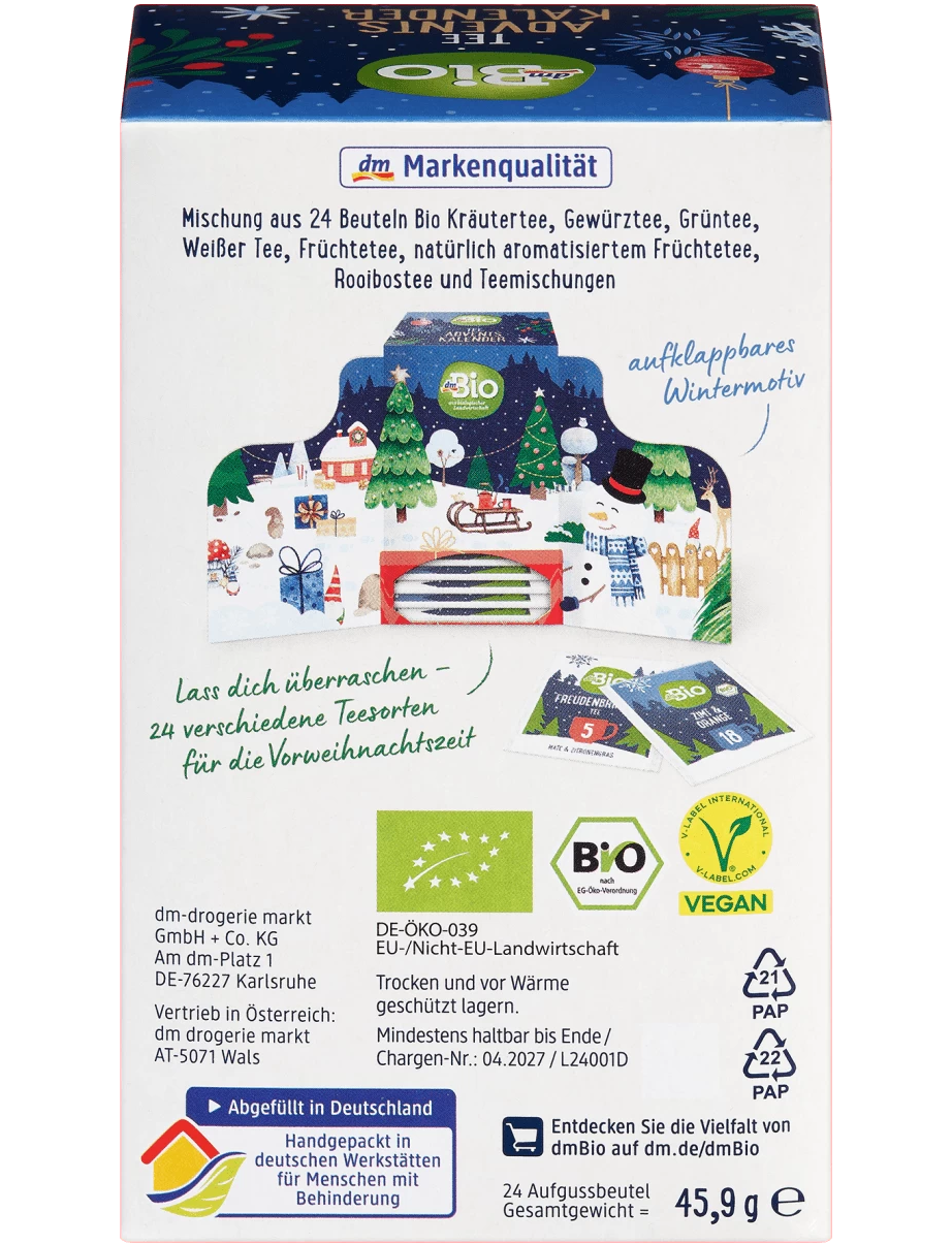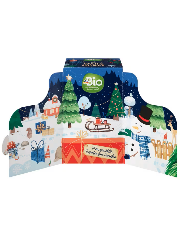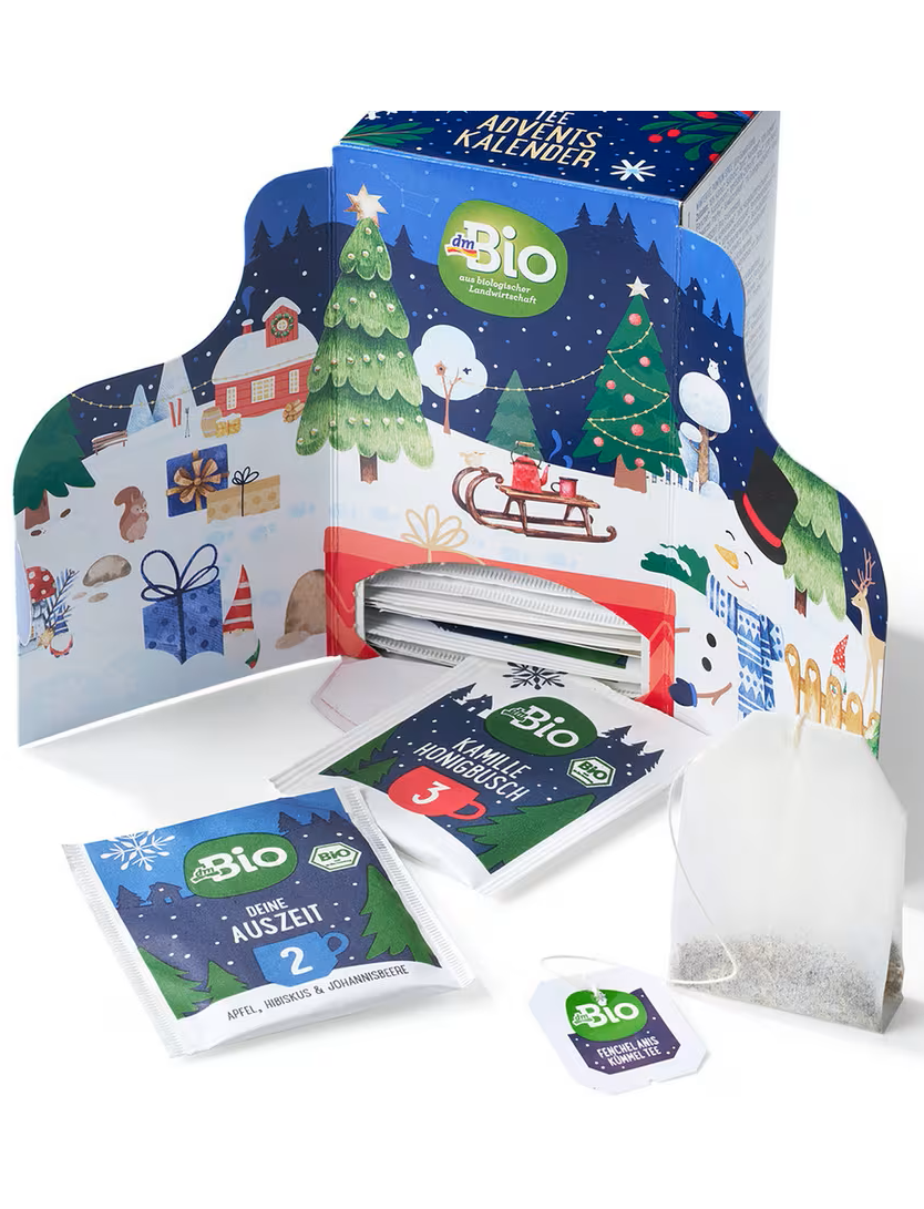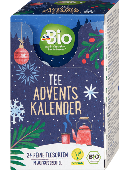 Чайний різдвяний календар dmBio пропонує барвисте розмаїття передріздвяного сезону завдяки 24 різним сортам чаю. Він містить суміш різдвяних та класичних чаїв і запрошує вас щодня відкривати для себе новий світ смаків. Чайні пакетики можна виймати окремо, що робить щоденний чайний ритуал особливо зручним. Цей календар стане чудовим супутником протягом грудня до Різдвяного вечора.