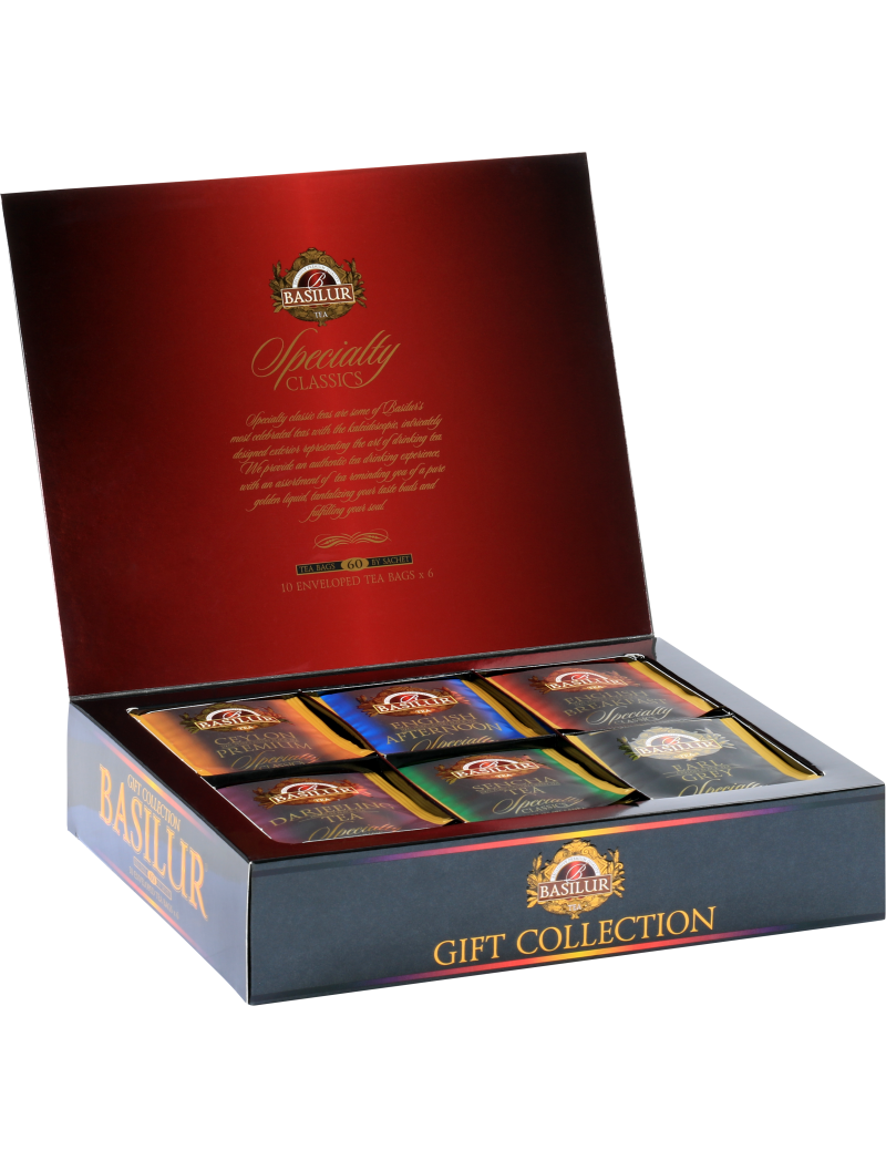 В упаковку входять класичні смаки чаю без добавок: English Breakfast - міцний чорний чай для сніданку, English Afternoon - ніжний чорний полуденок, Ceylon Orange Pekoe - класичний чорний цейлонський чай, дуже ароматний, Darjeeling - чорний, ніжний індійський чай, Sencha - ніжний зелений. чай Ерл Грей - чорний чай з бергамотом.