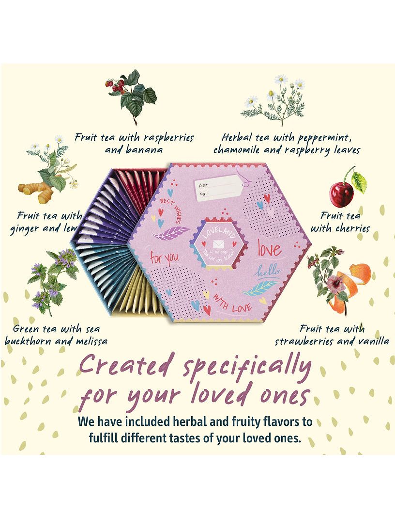 Створений спеціально для ваших близьких - ЧАЙНИЙ НАБІР LOVELAND. Ретельно підібрані смаки чаю зігріють ваші та ваших найдорожчих сердець. Красива коробка для чаю вирішує проблему ідеї подарунка, її можна подарувати як маленький сюрприз і як теплий сувенір на будь-яке свято. Здивуйте своїх батьків, друзів, коханих або колег цим чудовим подарунком.
