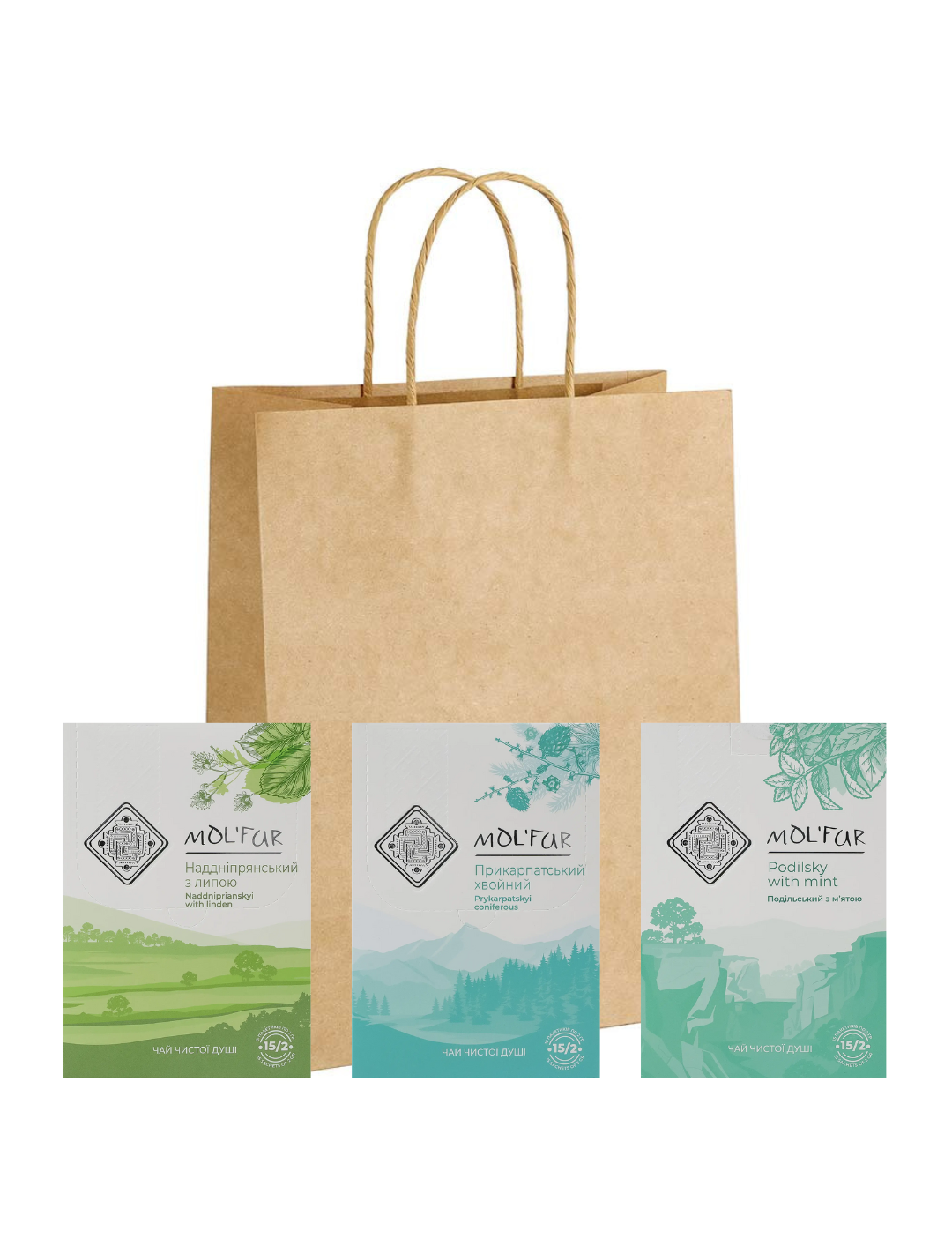 Набір складається з 3 упаковок пакетованого чаю MOL'FAR в крафтовому пакеті: