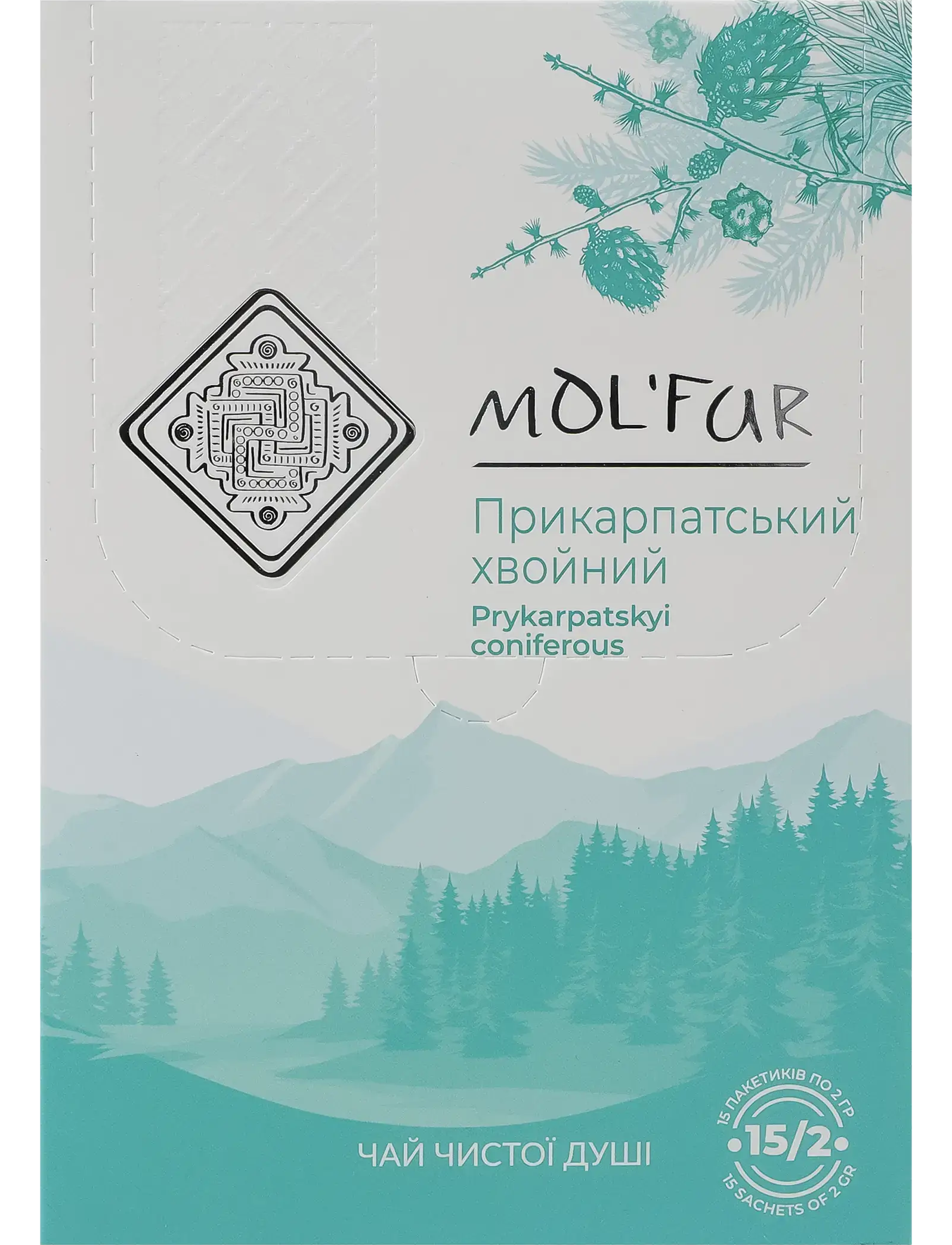 - MOL'FAR Чай чорний Прикарпатський Хвойний: чай чорний, цвітіння смереки, ягоди ялівцю, ягоди лимонника, чебрець, лимонна трава