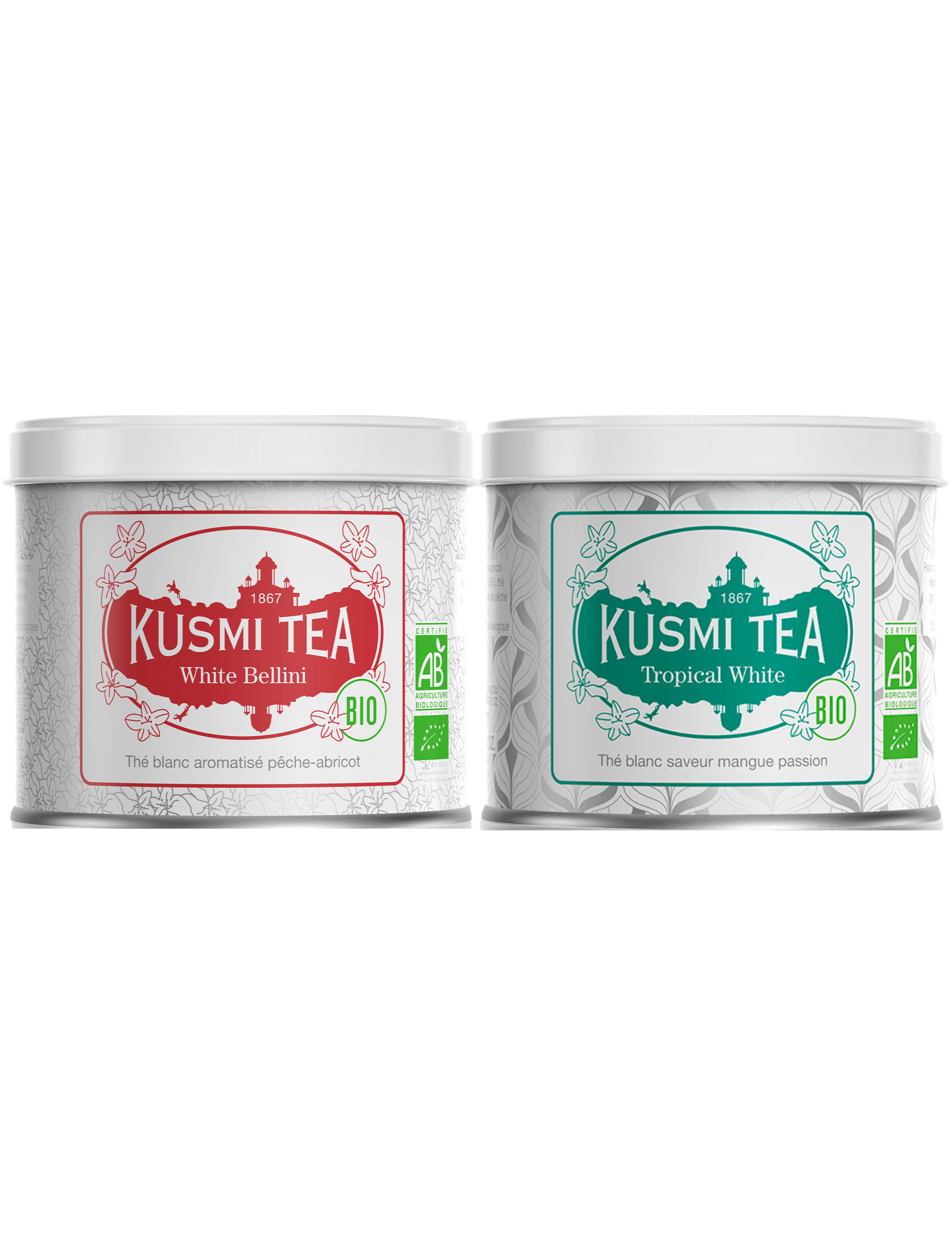 Склад: білий чай* 60%, зелений чай* 35%, натуральний аромат маракуйї 4%, натуральний аромат манго. *Продукція органічного землеробства. - Kusmi Tea White Bellini Чай білий Белліні органічний листовий 90 г - Органічний білий чай зі смаком персику та абрикосу.